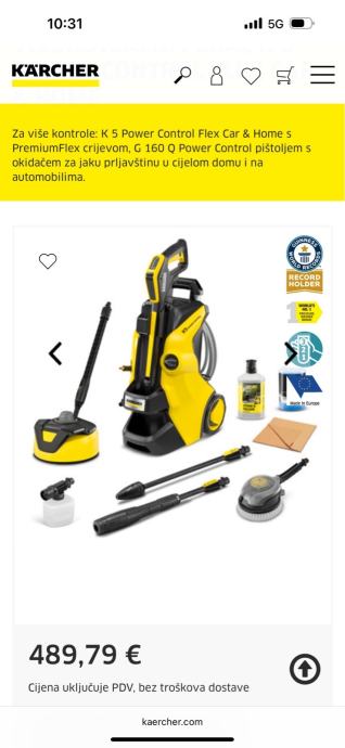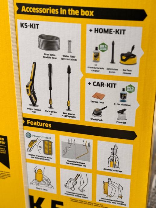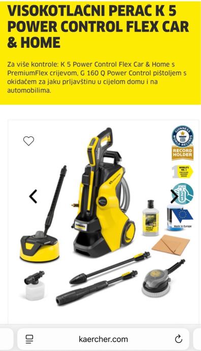 Uz visokotlačni perač K 5 Power Control Flex Car & Home svaka se površina može očistiti pod pravim pritiskom. Savjetnik za aplikacije integriran u aplikaciju Kärcher Home & Garden pomaže korisniku pronaći pravi pritisak pružajući praktične savjete o svakoj situaciji čišćenja i zadatku čišćenja – za savršene rezultate čišćenja. Za maksimalnu kontrolu, razina tlaka može se jednostavno podesiti okretanjem cijevi za prskanje ili provjeriti na G 160 Q Power Control pištolju za okidanje. Visokotlačni perač također impresionira Kärcher Plug 'n' Clean sustavom deterdženta za laku izmjenu deterdženta, PremiumFlex visokotlačnim crijevom za dodatnu praktičnost, visokokvalitetnom aluminijskom teleskopskom ručkom za lak transport, Quick Connect sustavom za uštedu vremena i truda koji uključuje i izvlači visokotlačno crijevo iz uređaja i pištolja za okidanje, kao i parkirnim položajem koji osigurava lako dostupan pribor u svakom trenutku. Uključuje komplet za automobil i dom s T 5 sredstvom za čišćenje površina i 1 litrom 3-u-1 sredstva za čišćenje kamena, mlazom pjene, rotirajućom četkom za pranje i 1 litrom šampona za automobile.