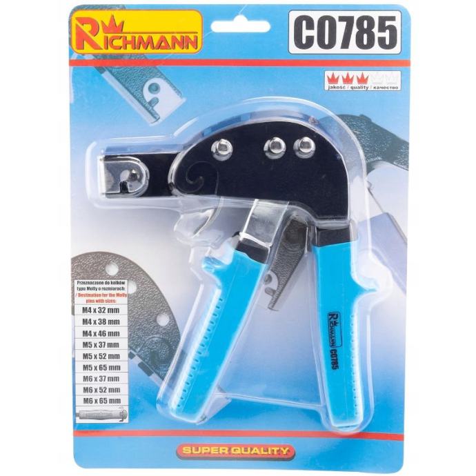 Molly kliješta za gipsane ploče (gipsane ploče)korištenje ove vrste alata skraćuje dugotrajan rad s odvijačem, zahvaljujući kojem je za savršeno stezanje čepa potrebno nekoliko sekundi.dizajniran za brzo, ponovljivo stezanje tipli montiranih u gipsane ploče ili materijale s praznim prostorom.da biste ugradili iglu u materijal, potrebno je umetnuti iglu u izbušenu rupu, staviti izbočeni dio vijka u prednji utor klešta i zategnuti ručke kliješta.ergonomske profilirane plastične ručke.vrhunska kvalitetadizajnirano za Molly tiple sljedećih veličina:M4 × 32 mmM4 × 38 mmM4 × 46 mmM5 × 37 mmM5 × 52 mmM5 × 65 mmM6 × 37 mmM6 × 52 mmM6 × 65 mmTehnički opis: vrsta: kliješta Mollydužina kliješta [mm]: 170težina [kg]: 0,46]]>