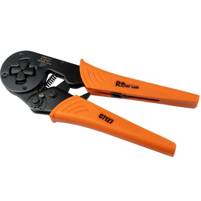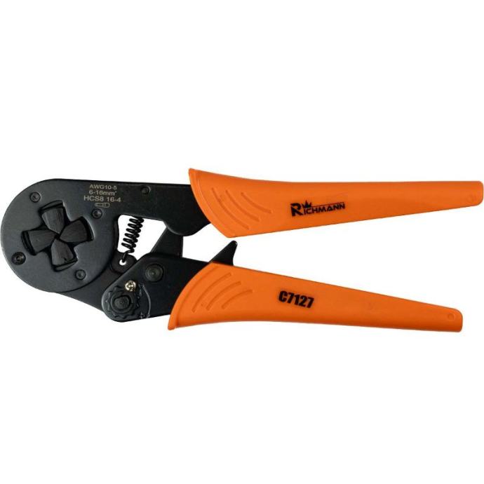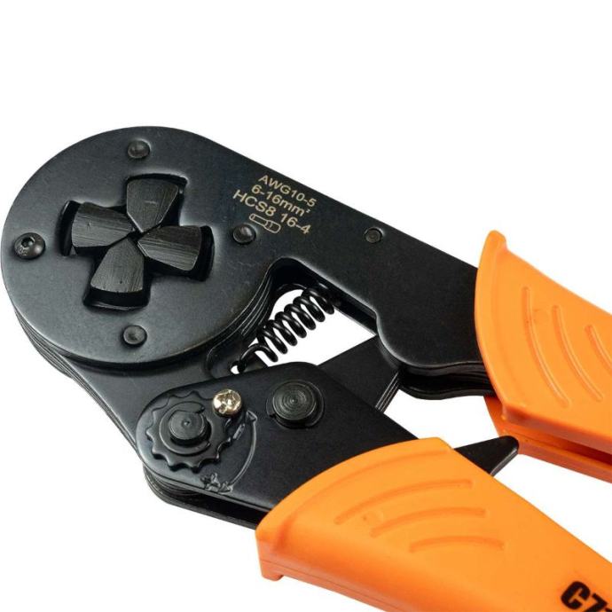 kliješta za stezanje za 6-16 MM2, 16-4 priključne čahurealat za trajno i sigurno spajanje električnih žica pomoću rukavacazahvaljujući poluzi, krimpiranje se izvodi velikom snagom, što jamči trajan spojkliješta su opremljena gumbom koji omogućuje podešavanje sile stezanja na 11 razinaimaju kvadratni sustav stezanjaTehnički podaci:tip: kliješta za terminaleduljina: 210 mmraspon: 6-16mm2AWG 10-5HCS8 16-4težina: 540gtežina s pakiranjem: 580g]]>