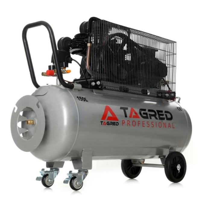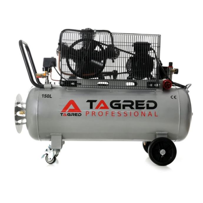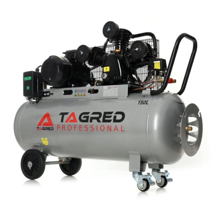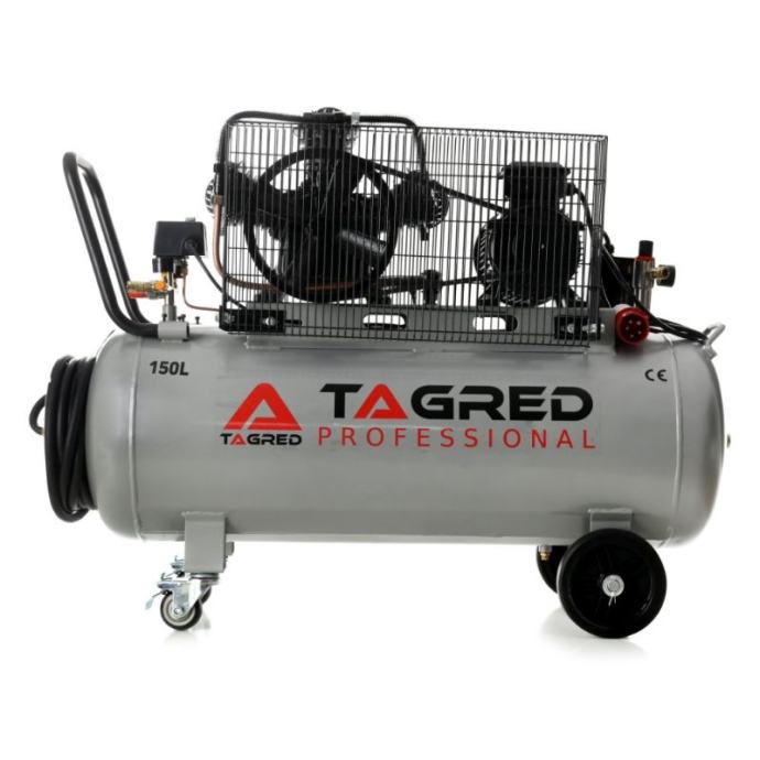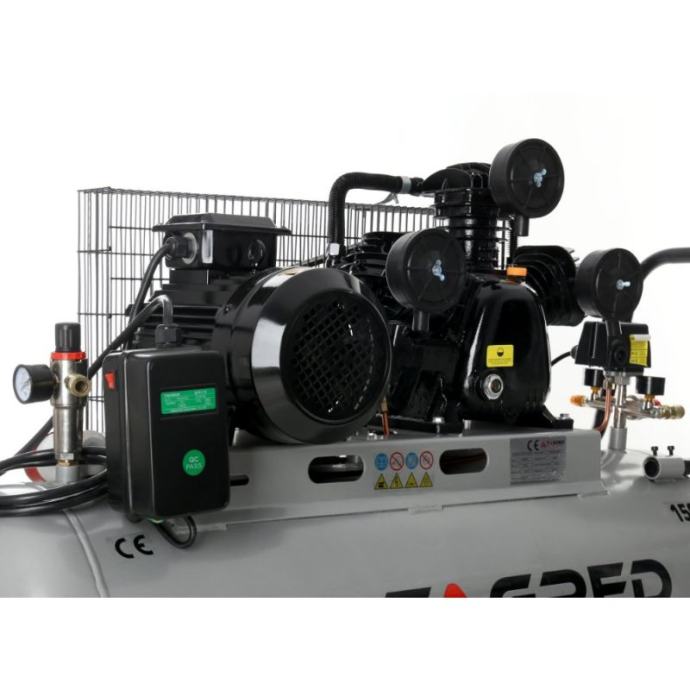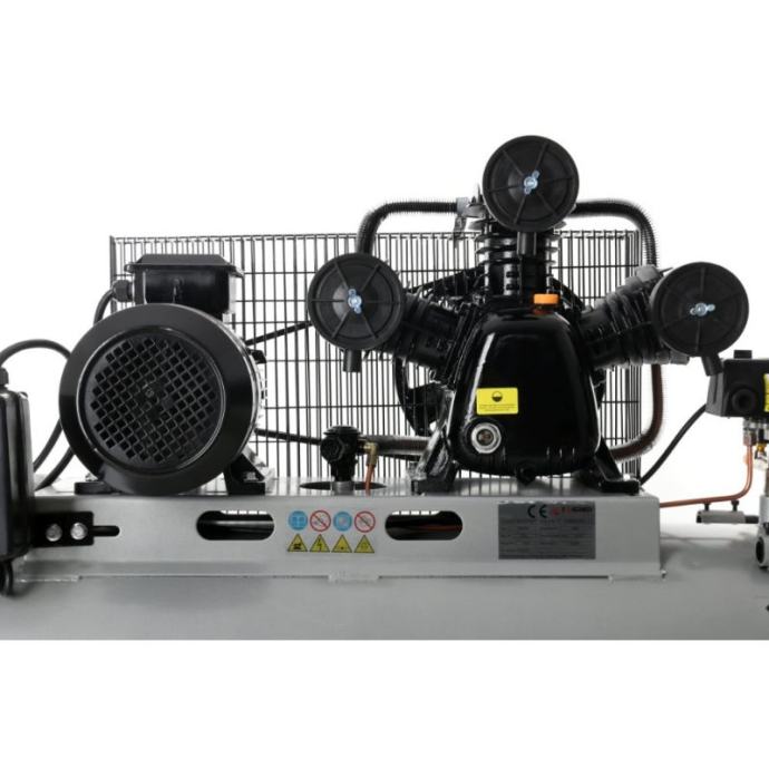 Napomena:Fotografije su informativnog karaktera. Artikl NE uključuje brzu spojku, crijevo, separator ni dodatno ulje, ali ih je moguće naknadno kupiti.kompresor je opremljen separatorom ulja s redukcijskim ventilom koji zaustavlja vodu i ulje u ispušnom zraku (separator)ergonomski - ima redukcijski ventil opremljen inovativnim mehanizmom za podešavanje donjeg i gornjeg tlaka, 2 velika metalna manometra smještena na kompresoru u položaju koji olakšava očitavanje parametara i odvodni ventil koji je jednostavan za rukovanjeekonomično - široka rebra za bolje hlađenjemobilni - ima kotače koji olakšavaju kretanjekompresor karakterizira niska potrošnja energije uz održavanje visokih radnih parametaravisoka učinkovitost protoka zrakapovećani promjer i veliki protok sprječavaju začepljenjenamijenjeno za hobi upotrebuTehnički podaci: trofazno napajanjebroj klipova - 3spremnik - 150 litaranapon - 400V / 50 Hzmaksimalni tlak u spremniku - 10 BARradni tlak - 8 BARsnaga motora - 4,1 kW - 5,6 KSmaksimalni protok - 650 l / minučinkovit protok, učinkovit u puhanju - 420-425 l / min.brzina motora - 2840 o/minbrzina pumpe - tip niske brzine 1440 o/minrazina zvučnog tlaka - 72,4 dB (A)razina akustične snage - 87 dB (A)razdjelnik: daveličina: 121x91x48 cm]]>