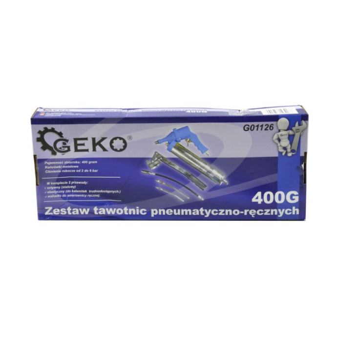 pneumatsko-ručna mazalica namijenjena za rad u radionici gdje se zahtijeva preciznost i točnostspremnik kapaciteta 400 ml, opremljen ventilom za odzračivanje i rasterećenjemdizajniran za korištenje s patronama od 400 gTehnički opis: izmjenjive glave - ručne poluge i pneumatskebrtva klipa otporna na masti i uljaergonomska i sigurna polugaradni pritisak: 2 - 6 barakapacitet 400 mltototnica prilagođena za rad sa patronama kapaciteta 400gUključuje: 2x mazalica s 4 čeljustišiljasti vrhsavitljivo crijevo 9x200 mm2x cijev za podmazivanje, savijena 150 mm]]>