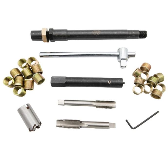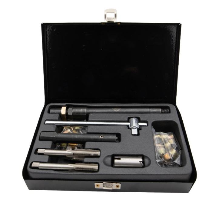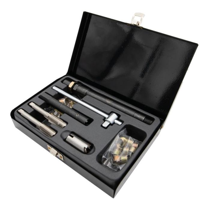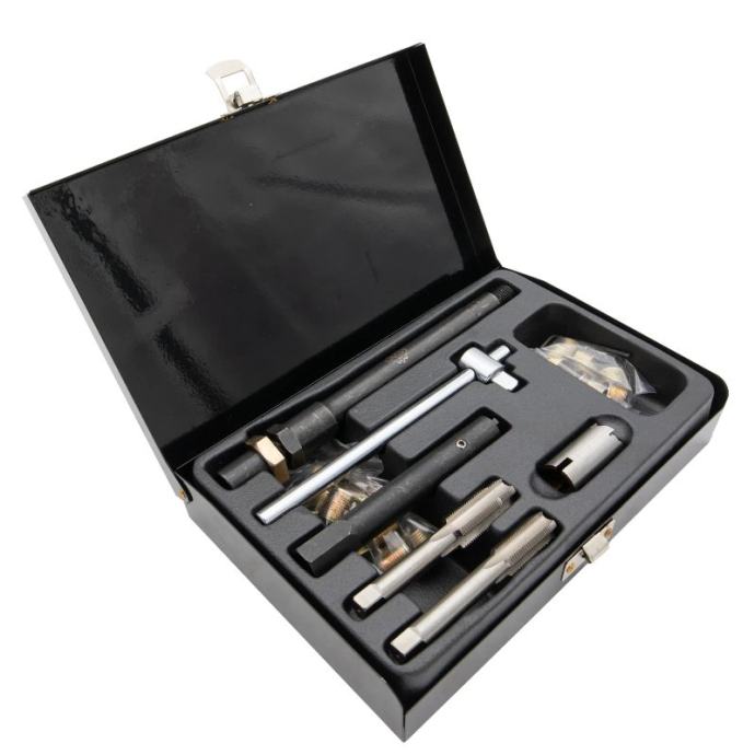 Alat za popravak navoja svjećice koji pomaže obnoviti oštećeni navoj svjećice u bloku motora ili cilindru. Navoji svjećica ponekad se mogu oštetiti ili istrošiti, što otežava ili čak onemogućuje zamjenu ili uklanjanje svjećica. U ovom slučaju kit za popravak navoja svjećice može biti vrlo koristan, jer omogućuje obnavljanje oštećenog navoja, a problem su skupi popravci ili zamjena bloka motora ili glave motora.Uključuje konusne i utične klinove s integriranim drškom. Stepenasti klin osigurava ispravno poravnanje rezača u otvoru svjećice. Alati za produljenje omogućuju lak pristup dnu udubljenja utikača. Uključuje set za umetanje Tehnički podaci:1 kom x ureznica M14x1,25 mm1 kom x stepenasta ureznica M14/M16×1,25 mm10kom x umetak duljine 9,4 mm10kom x umetak duljine 15 mm]]>