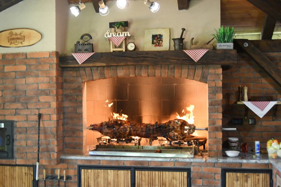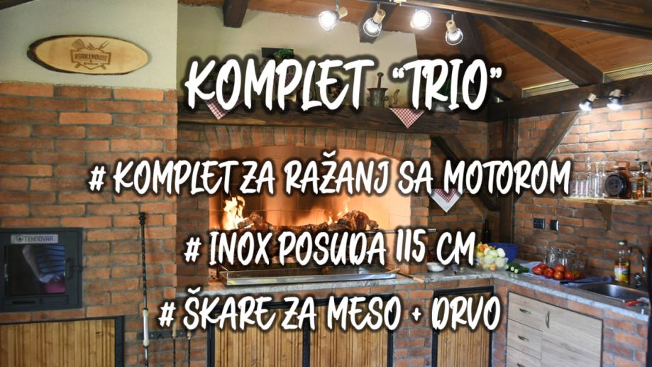 Komplet za ražanj sa motorom, posuda za mast 115 cm i škare za sječenje mesa sa drvenim postoljem u kompletu po povoljnijoj cijeni.