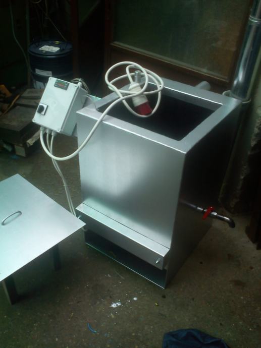 Kapacitet 80 litara, Zagrijavanje sa dva elektro grijača od po 3 KW a preko termanol ulja koje se nalazi u duplim stijenkama kotla.
