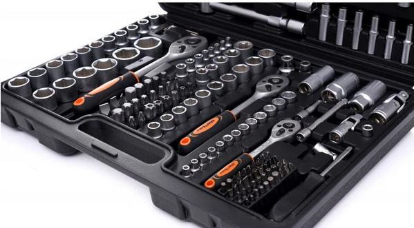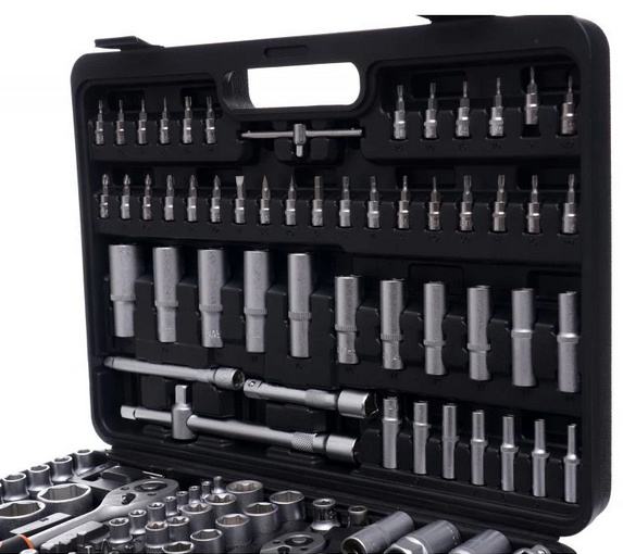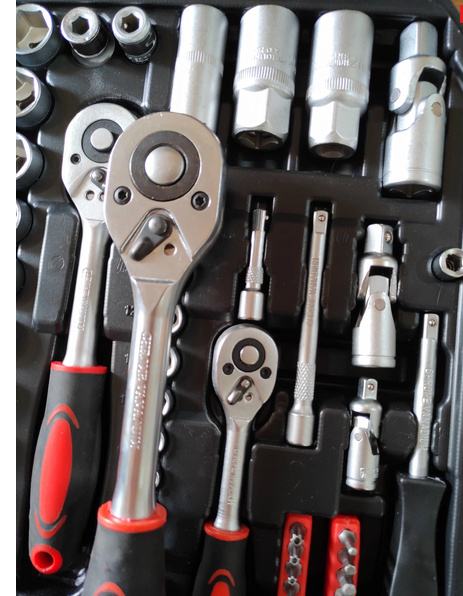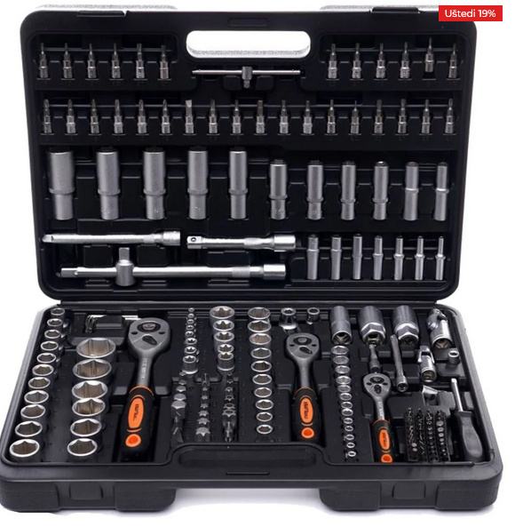 Profesionalna garnitura alata u izdržljivom PVC kovčegu, idealna za mehaničke radionice, servise i zahtjevne korisnike. Sadrži ukupno 172 alata, uključujući tri račne različitih veličina (1/4", 3/8" i 1/2"), širok izbor nastavaka i dodataka za precizan i pouzdan rad.