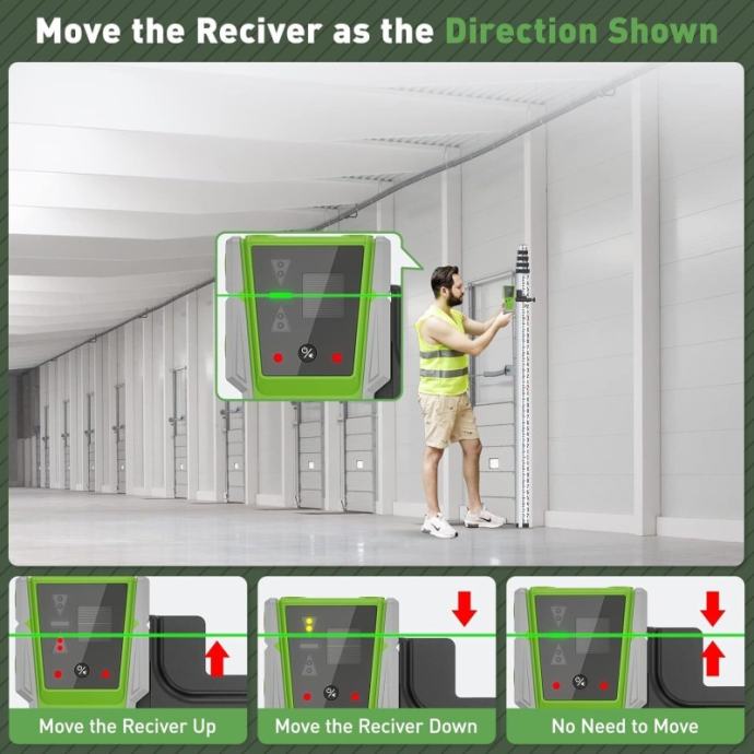 Točnost: Visoka točnost ±1,5 mm; jednostavno daje upute korisniku da postavi laser više ili niže na nagibnu šipku. To osigurava točno očitanje razine u svakom trenutku.
