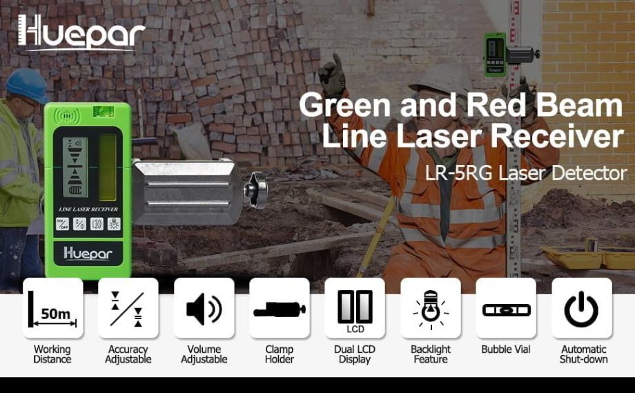 Huepar - Huepar LR -5RG posvećeni prijemnik može se koristiti samo s Huepar laserskim laserskim grickalicama, koji imaju na umu da se prijemnik ne može upotrijebiti s rotacijskim laserskim nibelom‼, a prijemnik se ne može koristiti s laserskim nibilima 9011g & 9211G Koristite razinu razine s Huepar 901CG/902CG, Box-1G/R, 8211G, 621CG/R, 622CG/R, 602CG/R, 603CG/R, GF360G/R, itd.