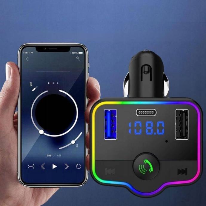LED RGB auto FM transmiter MP3 bluetooth 5.0 i punjač 2x USB 3.0 12-24