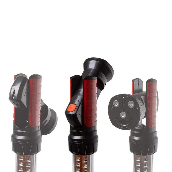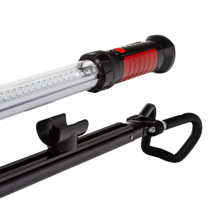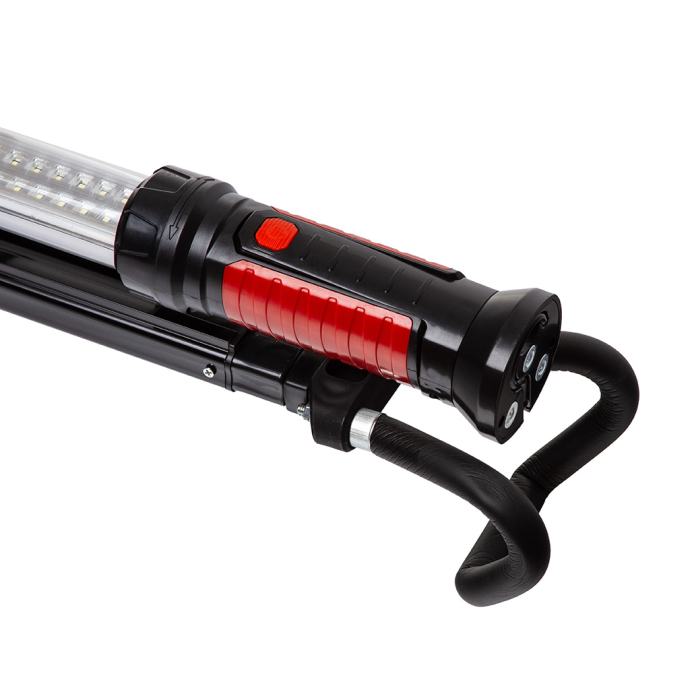 Svjetiljka se može postaviti u držač s oprugom. Kut oba držača može se podesiti. Jaki magnet na krajevima ručki. Dodatne kuke na ručkama. Radionička svjetiljka je opremljena izuzetno praktičnim mehanizmom koji vam omogućuje da objesite lampu na mnoga praktična mjesta, kao što je na poklopcu motora ili poklopcu prtljažnika. Širok raspon ručki i multifunkcionalnost.