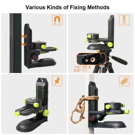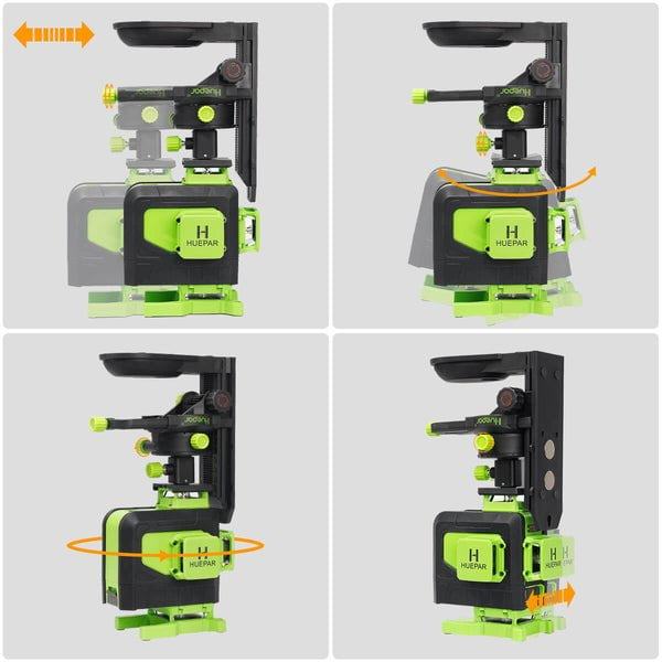 FINO -TUNER HUEPAR LASER LASERSKA ZA POSTAVLJANJE POMOĆE POMOĆ UDATI LIJEVNI I DESNI položaj unutar 1,2 inča (3 cm), prednji i stražnji položaj unutar 2,2 inča (5,5 cm), visina unutar 3,6 inča (9 cm) i horizontalna rotacija 360 °. Konstrukcija je označena u centimetarima i inčima za lakše čitanje. Priloženi namjenski adapter pomaže u objesiti laserski alat, omogućavajući laserski prozor bliže zidu.