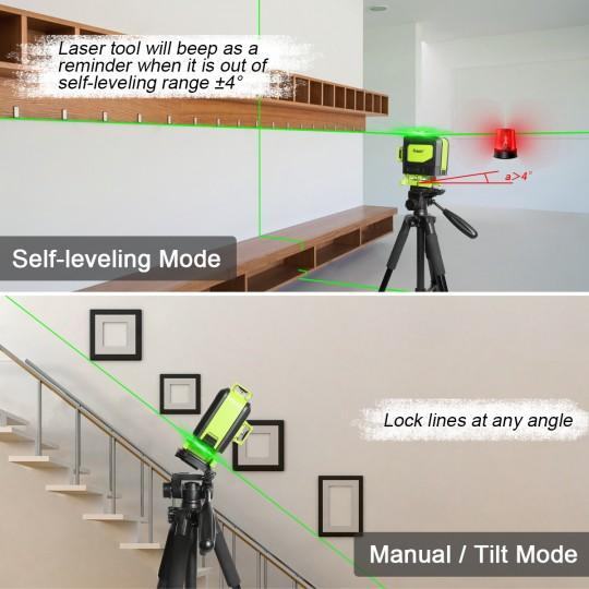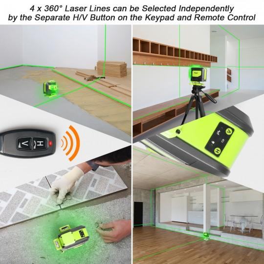 Ovaj laserski alat pruža četiri 360 ravnica laserske svjetlosti. Gornja horizontalna linija od 360 ° može se koristiti za ugradnju stropa. Podna horizontalna linija od 360 ° namijenjena je polaganju pločica.