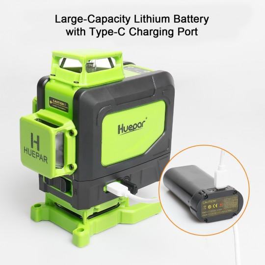 Laserska razina Huar 904DG koristi visoki kapacitet litij-ionskih baterija 3,7 V / 5200 mAh i osigurava do 6-12 sati rada. Li-ion baterija opremljena je priključkom za punjenje Type-C koji se može naplatiti odvojeno. Kad uklonite bateriju, možete koristiti ovu razinu 4D lasera na radnom mjestu tako što ćete je izravno povezati. 16-litrena razina lasera također se može napuniti prijenosnim računalom, bankama napajanja, punjačem automobila itd.