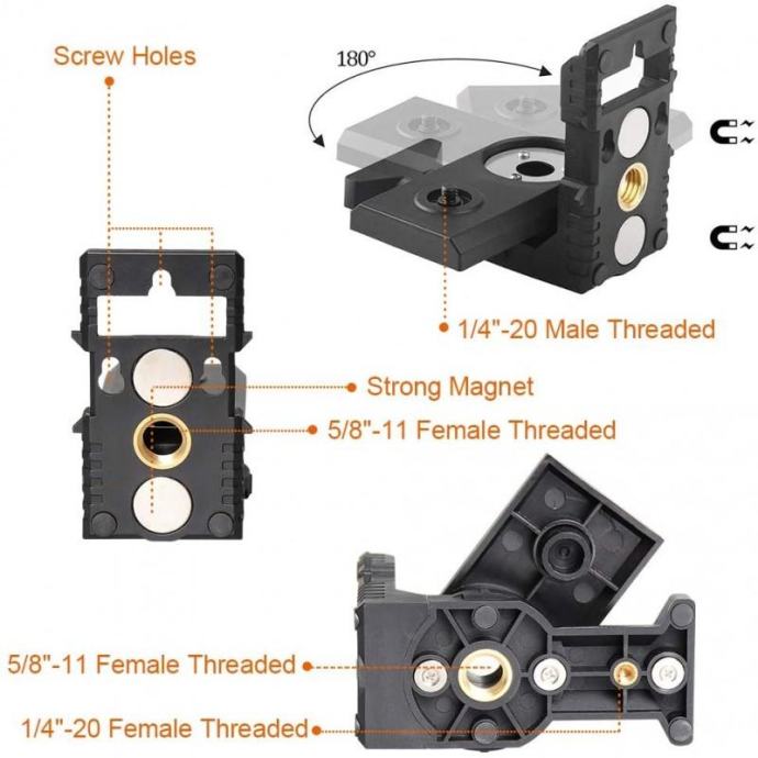 1/4 "Vanjski navoj za pričvršćivanje na razinu lasera, unutarnja nit 5/8" za ugradnju na stalke, laserske rupe.