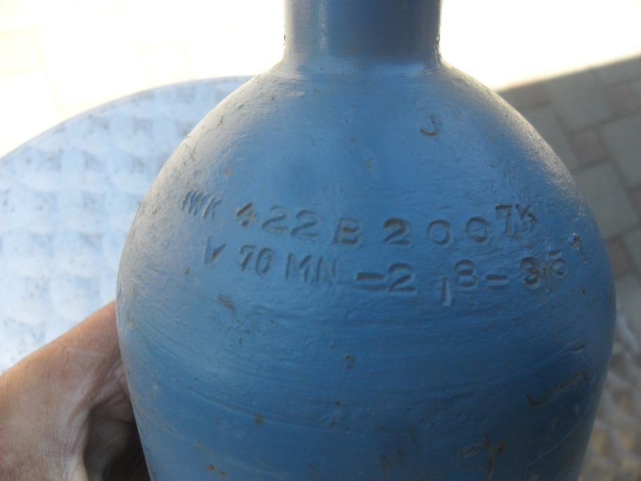 boca je ispravna,nema atest,moguče punjenje iz veče boce kisika,neznam koliko je litara,poslikane oznake pa protumačite,dužina boce za ventilom 47cm,promjer 10cm,može služiti za disanje ili varenje.