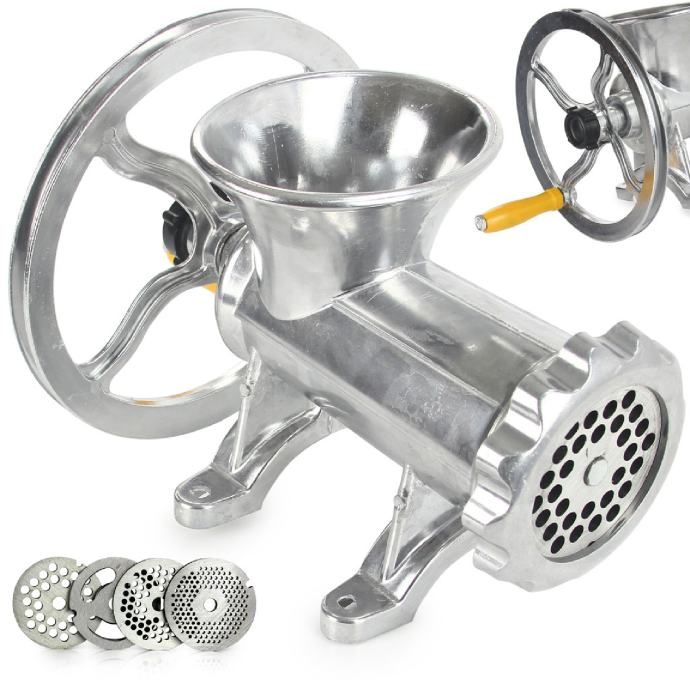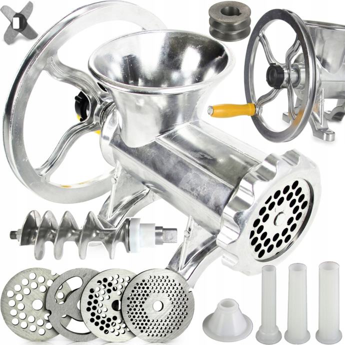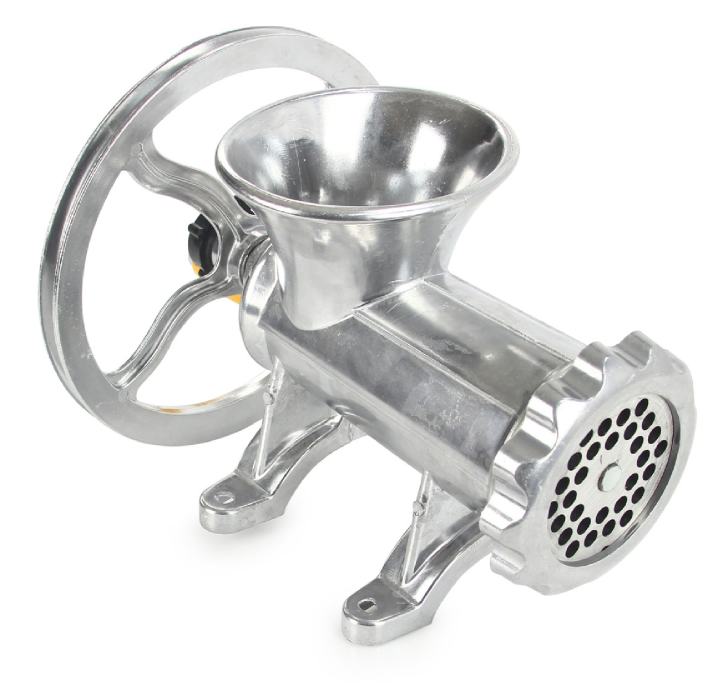Ručni stroj za mljevenje mesa - veliki M90137 izrađen je od aluminijske legure što ga čini laganim i čvrstim . Ovaj klasični ručni mlin s velikom polugom za okretanje nezamjenjiv je pomoćnik ne samo u mesnicama. Zahvaljujući remenici, koja je dio pakiranja, moguće ju je spojiti na elektromotor i tako je pretvoriti u profesionalni stroj za mljevenje mesa, voća ili izradu kobasica.
