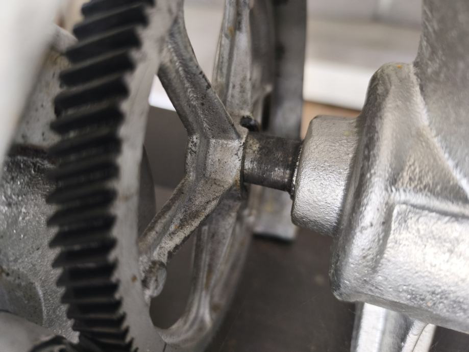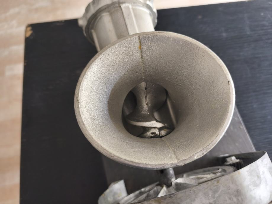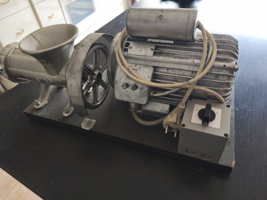 Prodajem mašinu za mljevenje mesa na struju, solidna i robusna izrada. Lijevani liveni lijevak označen brojem 22, što ukazuje na veličinu otvora. Mašina ima pogon s velikim zamašnjakom za lakše okretanje. Montirana je na drvenu podlogu za stabilnost prilikom korištenja. Funkcionalna i pogodna za domaću upotrebu. Na zamašnjaku fali klin koji pokreće mašinu.