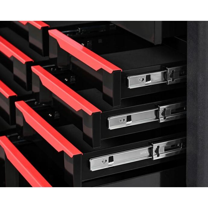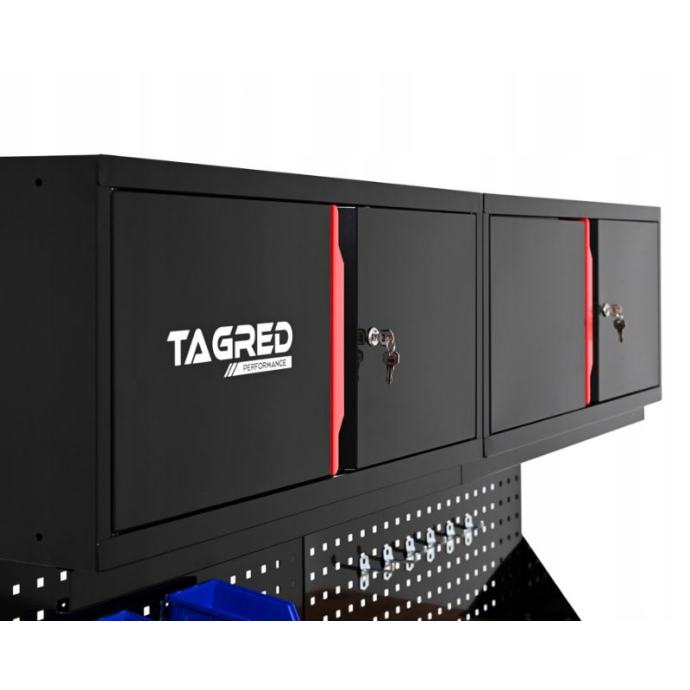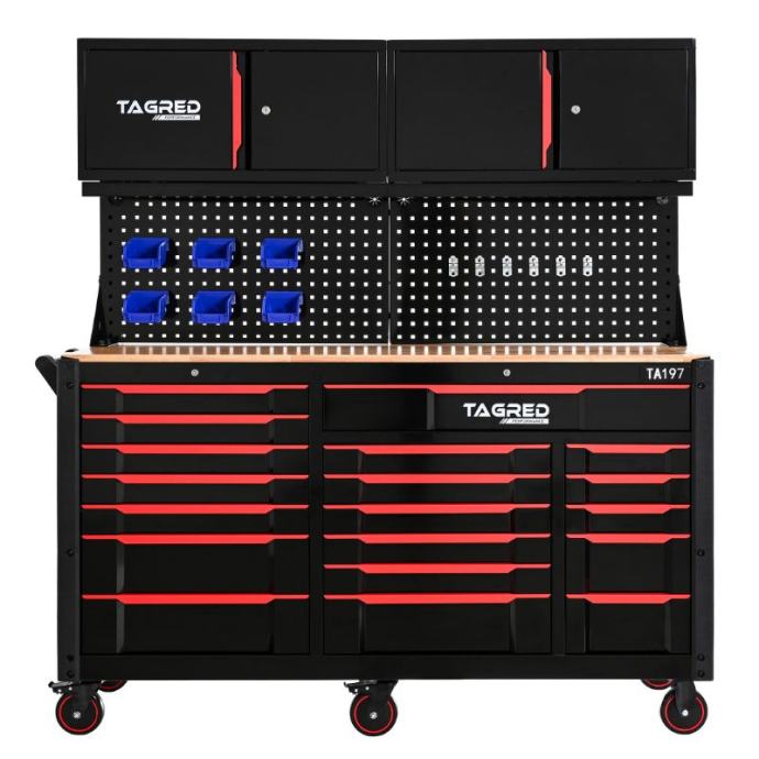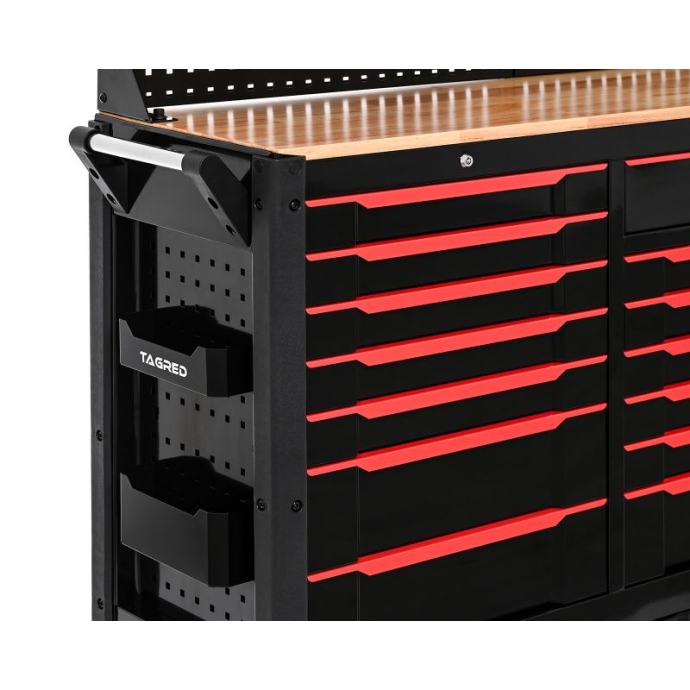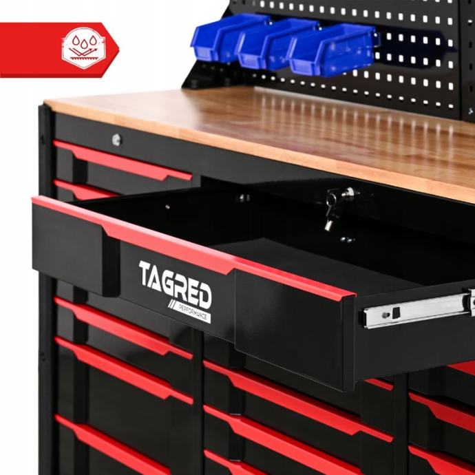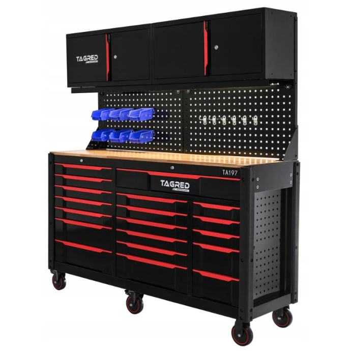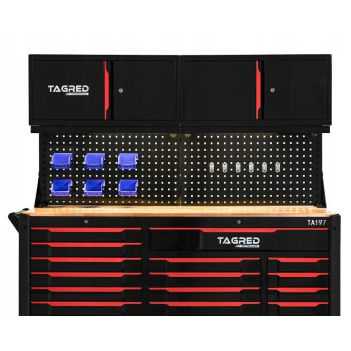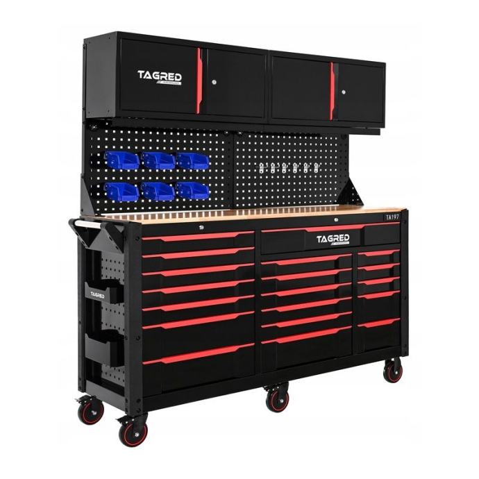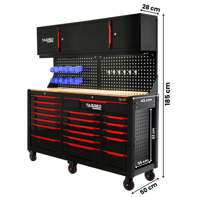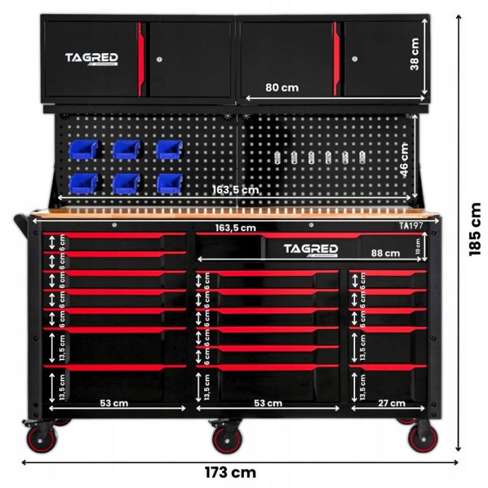 servisna kolica s prostranim ladicama, ploča za alat izrađena od dvije velike perforirane čelične ploče i četiri viseća ormarićadrvena radna ploča izrađena od impregniranog, izdržljivog, tvrdog kaučukovca s nosivošću do 650 kg upotpunjuje izgledrobusna konstrukcija radioničkog regala TA197, dovoljno prostora za pohranu alata, funkcionalnost i izdržljivost zadovoljit će očekivanja i najzahtjevnijih korisnikaTehnički podacimaterijali : aluminij, plastika, nehrđajući čelik,broj ladica: 19težina u paketu : 197 kgtežina bez pakiranja: 171 kgkada je sklopljeno, spremno za upotrebu: 1730 x 500 x 1850debljina lima: 1 mmoprema: nedimenzije paketa : 1720x530x1030kada je sklopljeno, spremno za upotrebu: 1730 x 500 x 1850težina u paketu : 197 kgtežina bez pakiranja: 171 kgdimenzije ploče stola:širina: 163,5 cmdubina: 42 cmdebljina: 2,5 cmkada je sklopljena, ploča stola je visoka 100 cmdimenzije gornjeg ormara (jedna dimenzija)širina 80 cmvisina 38 cmdubina 28 cmdimenzije perforiranog zidaširina 163,5 cmvisina 46 cmdimenzije bočne perforacijevisina 62 cmširina 35 cmladice s lijeve strane, donje x3 (A)širina 53 cmvisina 13,5 cmdubina 40 cmmanje gornje lijeve i srednje ladice (D) x10širina 53 cmvisina 6 cmdubina 40 cmgornja središnja ladica (B)x1širina 88 cmvisina 10 cmdubina 40 cmmanje desne ladice (E)x3širina 27 cmvisina 6 cmdubina 40 cmveće desne ladice (C)x2širina 27 cmvisina 13,5 cm]]>