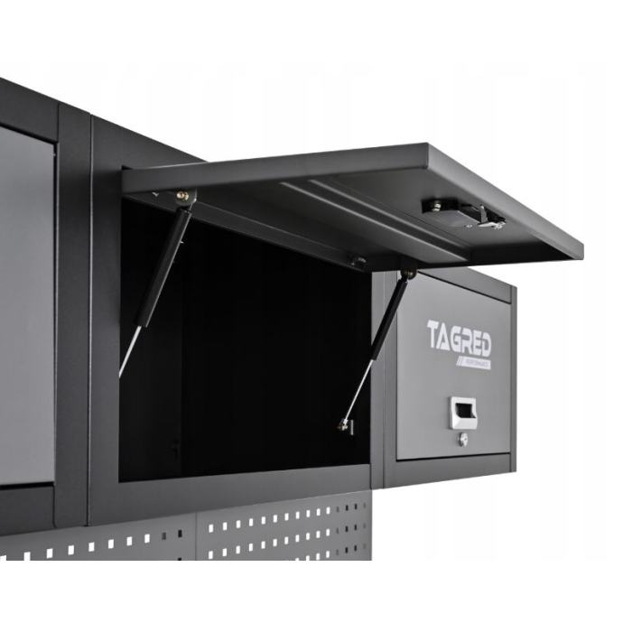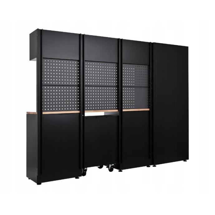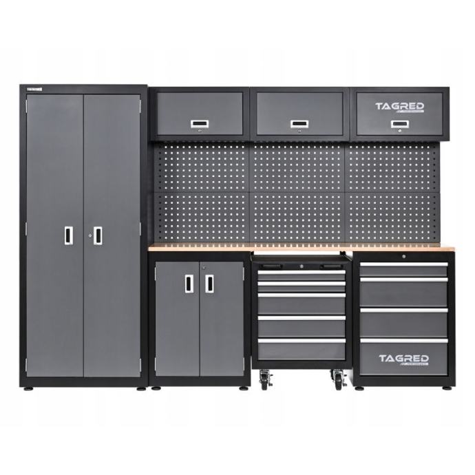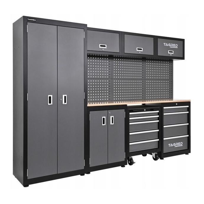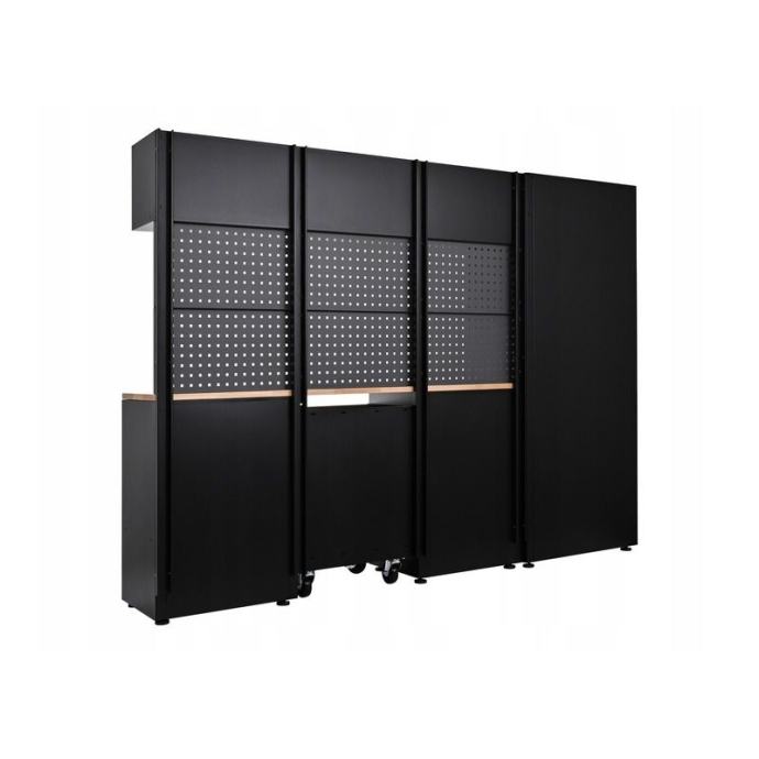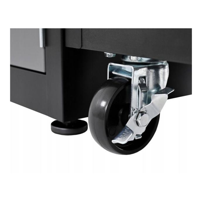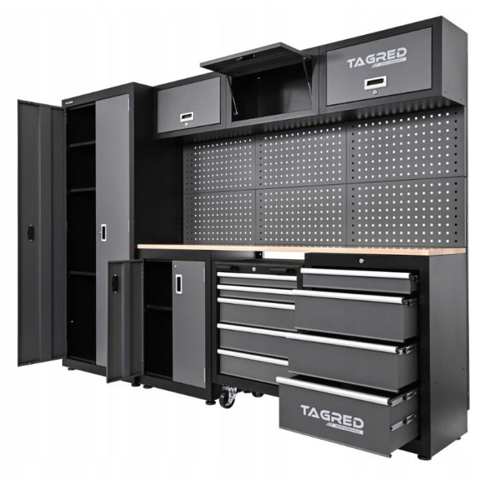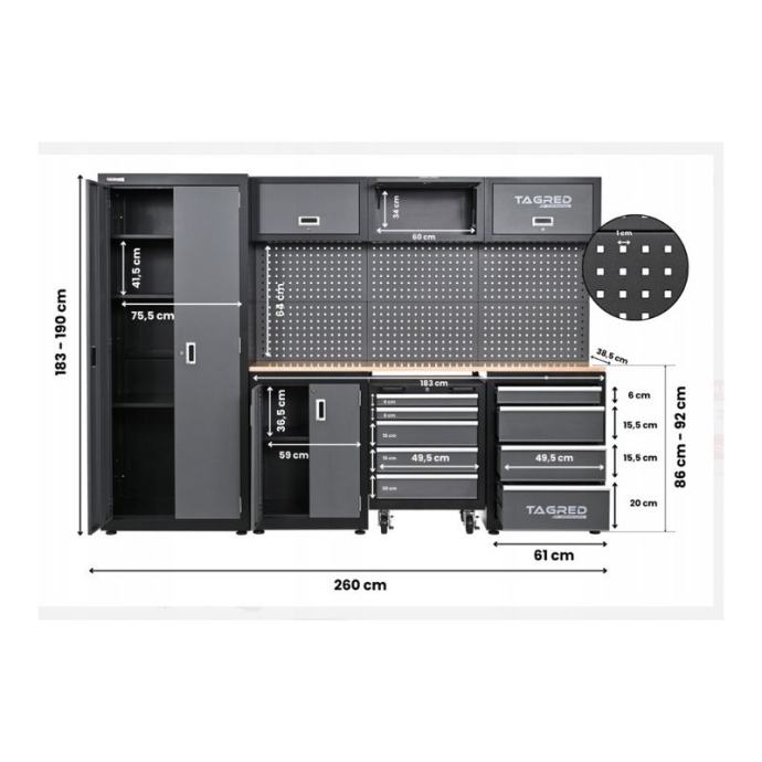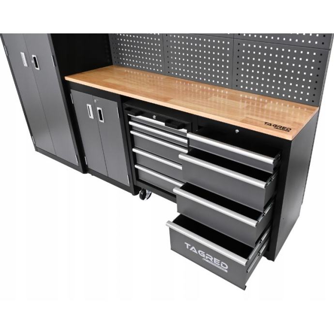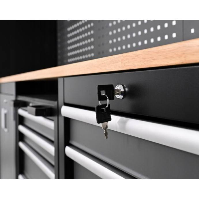 čvrsta konstrukcija, dovoljno prostora za pohranu alata, funkcionalnost i izdržljivost - ovaj set će ispuniti očekivanja i najzahtjevnijih korisnikaset uključuje: ormar s policama, ormar s ladicama, donji ormar s policom, ormar s ladicama na kotačićima, perforiranu ploču i radnu pločusvaki gornji ormarić opremljen je dvostrukim plinskim oprugama, što osigurava glatko i jednostavno otvaranje te sigurno drži prednju stranu u otvorenom položajuojačana donja ladica na klizačima s dvostrukim kugličnim ležajevimanajveća donja ladica opremljena je klizačima s dvostrukim kugličnim ležajevima, lako podnoseći teret do 60 kgTehnički podaci: ukupna širina: 260 cmpodesiva visina: 183 cm - 190 cmdubina: 46 cmtežina: 189 kgdominantne boje: crna, sivamaterijali: čelik, kaučukovo drvo (gornji dio)premaz: praškasto premazano, otporno na ogrebotinebroj ladica: 4 + 5 ladica u ormariću na kotačimaručke: ergonomske, integrirane u konstrukcijuperforirana ploča: čelik, s rupama 10x10 mmpodešavanje nogu: 1,5 cm do 7 cmvrsta ormarića: ormarić s policama, ormarić s ladicama, donji ormarić s policom, ormarić s ladicama na kotačimaključ uključen: daudobno otvaranje bez potrebe za silomvrata ostaju trajno otvorenazaštita od slučajnog ispuštanja vratanosivost po ladici do 60 kgstabilan rad bez zaglavljivanjaglatko, potpuno izvlačenjeEVA obloga otporna na ulje i voduotpornost na ulje, mast i voduštiti alate od prljavštine i vlagepovećana trajnost umetkaDimenzije: veliki ormar:širina: 76 cmdubina: 46 cmvisina: 183 cmpolice (x4): 75,5 x 41,5 cmdonji ormar s policom:širina: 60 cmdubina: 40,5 cmpolica: 59 x 36,5 cmdonji ormar s ladicama:širina: 60 cmdubina: 40,5 cmladica 1: 49,5 x 34,5 x 6 cmladice 2 i 3: 49,5 x 34,5 x 15,5 cmladica 4: 49,5 x 34,5 x 20 cmdonji ormar s ladicama za kotačiće:širina: 60 cmdubina: 40,5 cmladice 1 i 2: 49,5 x 34,5 x 5 cmladice 3, 4, 5: 49,5 x 34,5 x 11,5 cmradna ploča:širina: 183 cmdubina: 38,5cmdebljina: 2,5 cmgornje police (x3):širina: 60 cmdubina: 28 cmperforirana ploča:duljina: 183 cmvisina: 64 cmrupe: 10 x 10 mm]]>