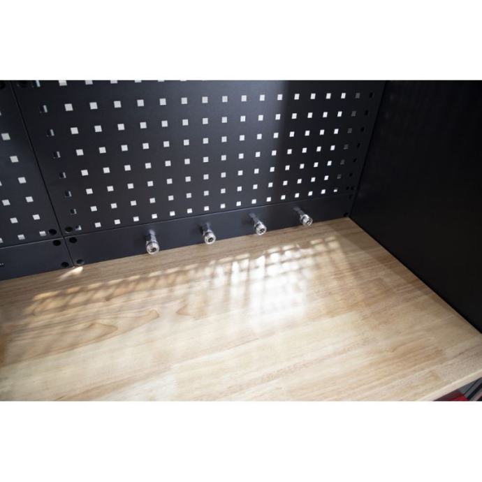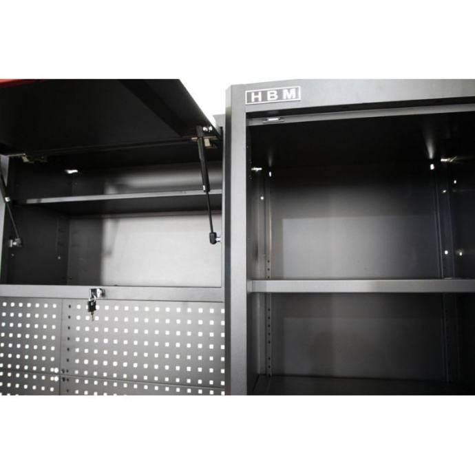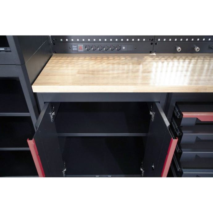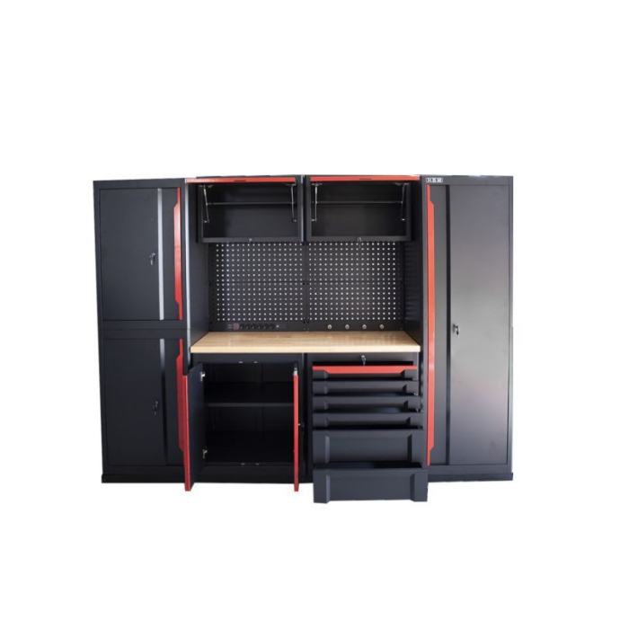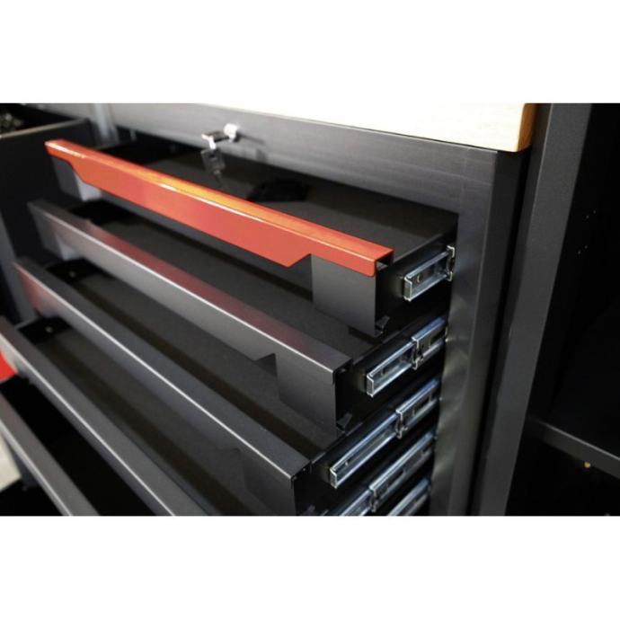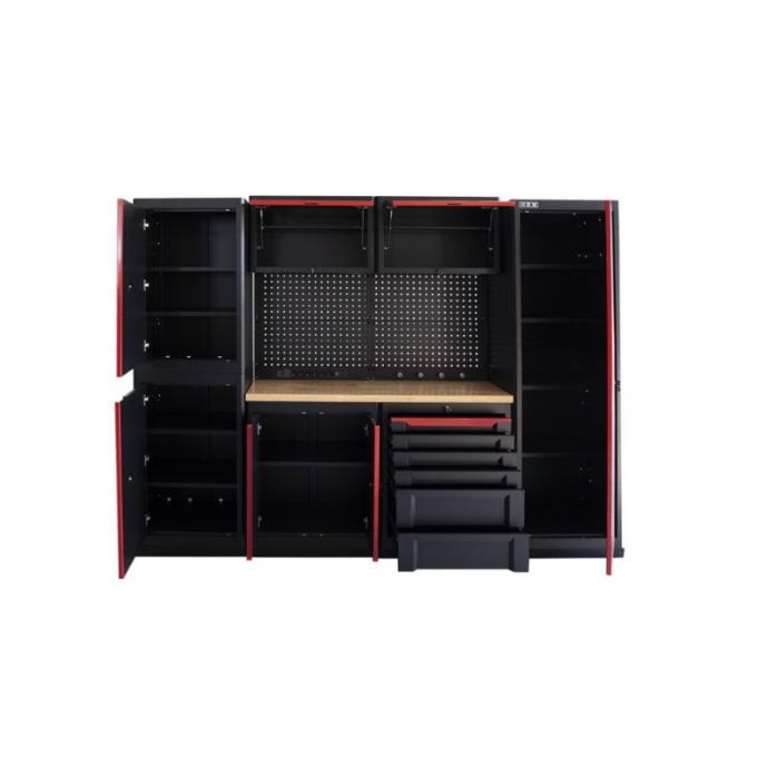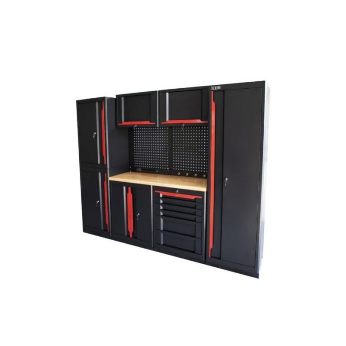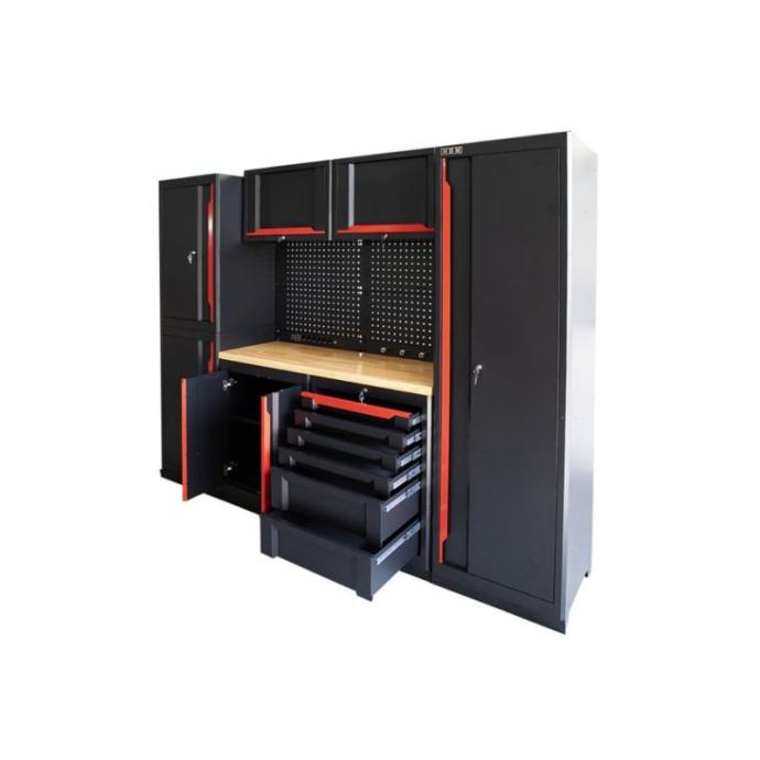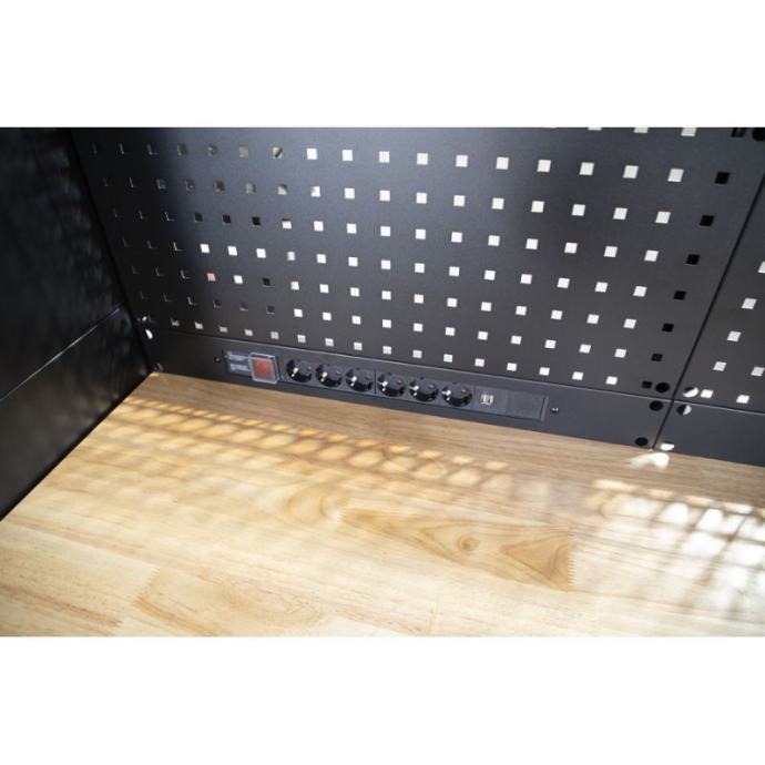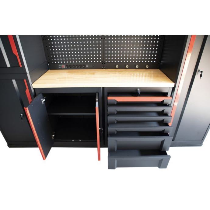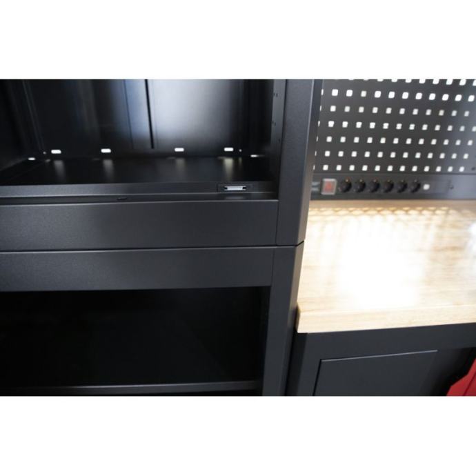 Ono što izdvaja ovaj sustav je mogućnost pojedinačnog zaključavanja svakog dijela, uključujući ladice i ormariće, zajedno s rezervnim ključevima za bezbrižnost. Ugrađeni razdjelnik za struju na stražnjoj stijenci, sa 6 mjesta utikača i praktičnim gumbom za uključivanje/isključivanje, dodaje dodatnu funkcionalnost. S ukupnim dimenzijama od 2016 mm u visinu, 2622 mm u širinu i 507 mm u dubinu, ovaj sustav radionica ne samo da pruža organizirano i učinkovito radno okruženje, već i profesionalan izgled svakom radnom prostoru.