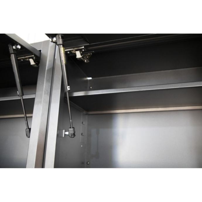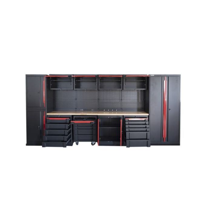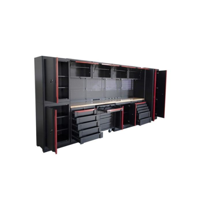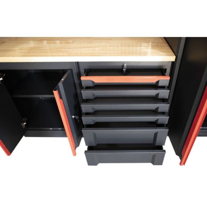 Ukupne dimenzije od 2016 mm visine, 4359 mm širine i 507 mm dubine čine ovaj sustav prostorno učinkovitim, dajući vam puno radnog prostora bez gubitka dragocjenog prostora na podu. Drvena radna ploča, s impresivnom nosivošću od 100 kg, ne samo da dodaje funkcionalnost, već i topao i privlačan izgled. Dimenzije od 1854 mm širine, 530 mm dubine i 38 mm debljine daju vam prostor koji vam je potreban za sve vrste projekata.