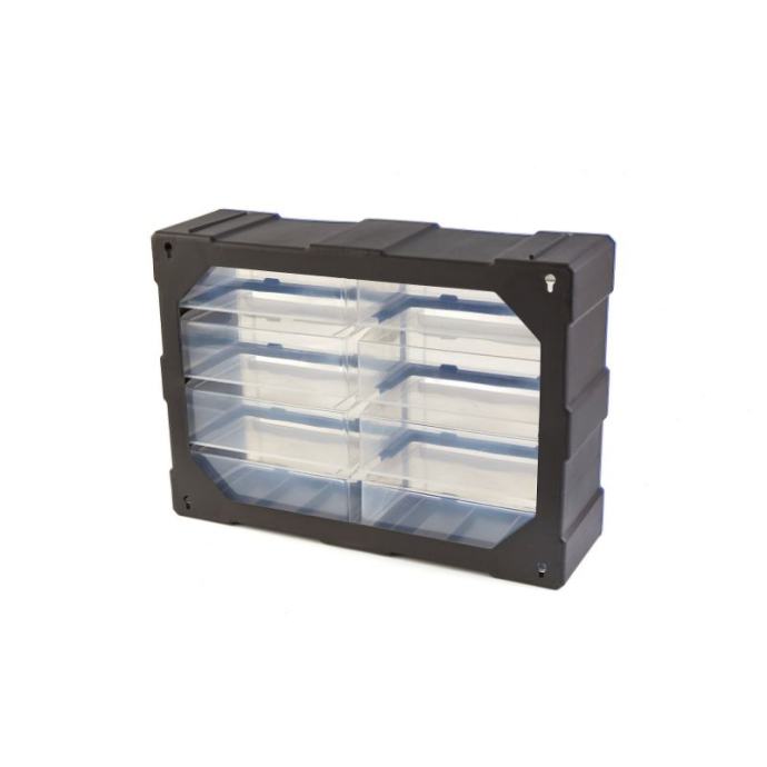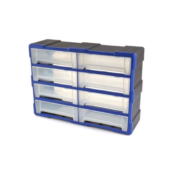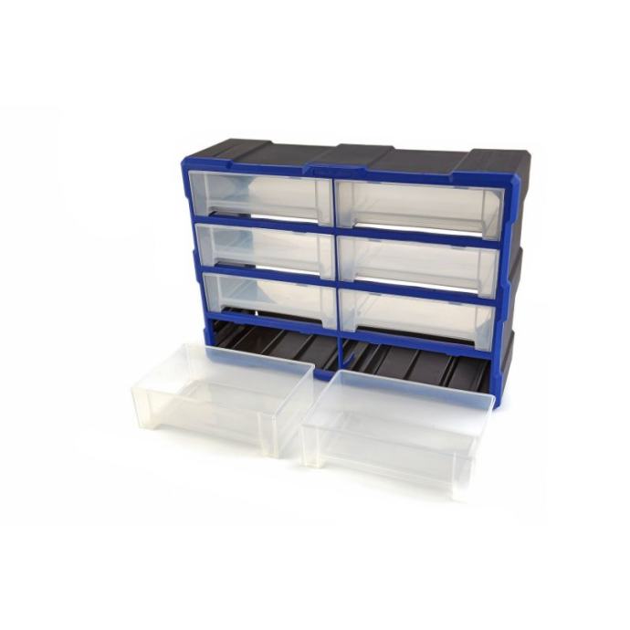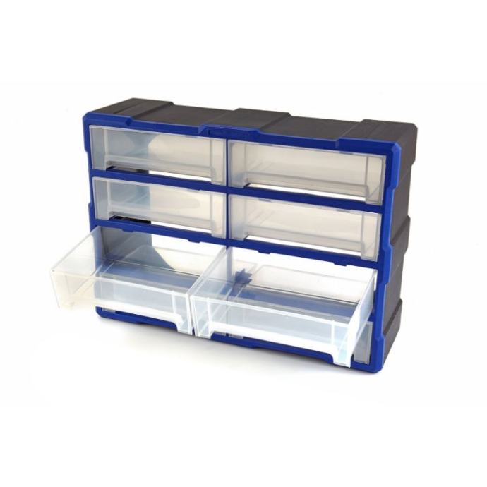 svakom majstoru kojem je važno da radi uredno dobro će doći dobra, robusna komoda kao što je ovaj model. Ormar ima nekoliko ladica za držanje sitnog i srednjeg alata i materijalaokvir ormarića sastoji se od plastike, tako da cjelina relativno malo teži. Unatoč tome, ormarić je vrlo čvrst, tako da u njemu bez problema možete držati i teže ili lomljive alate i dijelovesvaka od posuda je prozirna. To uvelike olakšava pregled nad vašim alatima. Na taj ćete način također brže pronaći potrebne alate za svaki posaokante na dnu imaju udubljenje koje zapravo služi kao ručka. Rezultat je da možete lako ukloniti spremnike i ponovno ih dodativitrinu sigurno postavljate uz zid ili zid, čime štedite puno prostora u svojoj radioniciTehnički opis: dimenzije: 52 (D) x 37 (V) x 16 (D) cmboja: Plava/Crnamaterijal kućišta: Nesalomljiva ABS plastikamaterijal ladice: polipropilenunutarnje dimenzije ladica: 230 x 145 x 70 mm]]>