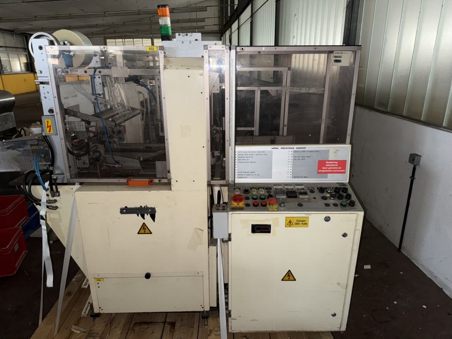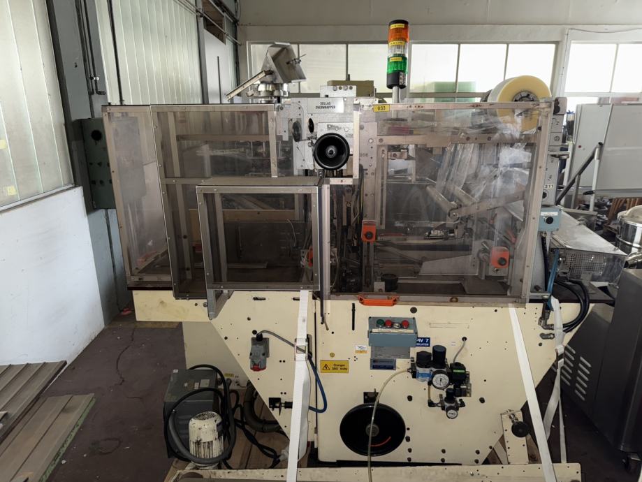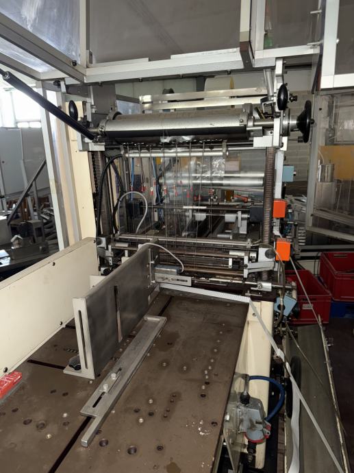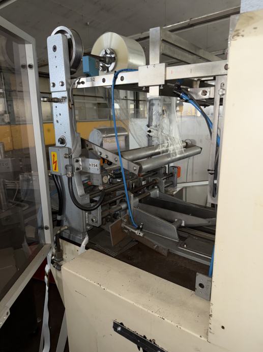 stroj iz role folije automatsko zamota kutijicu u foliju koji sagrije i stisne oko kutijice, kao folija na raznim proizvodima u trgovini (domacica keksi)