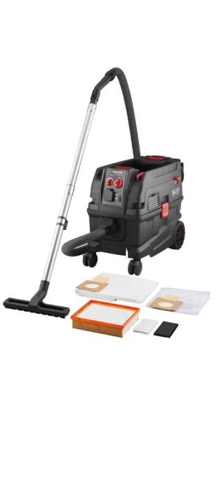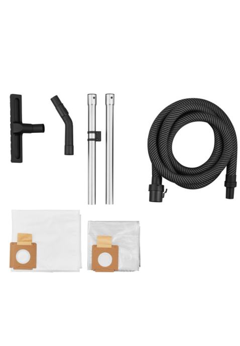 Uključeni dodaci: 1 x antistatičko usisno crijevo od tkanine od 3,5 m, 1 x ravni naborani filtar (klasa H - unaprijed sastavljen), 1 x filtarska vrećica od flisa s polietilenskom vrećicom (klasa H), 2 x utične metalne usisne cijevi, 1 x podna mlaznica za tepihe, 2 x filtera (prethodno sastavljena)