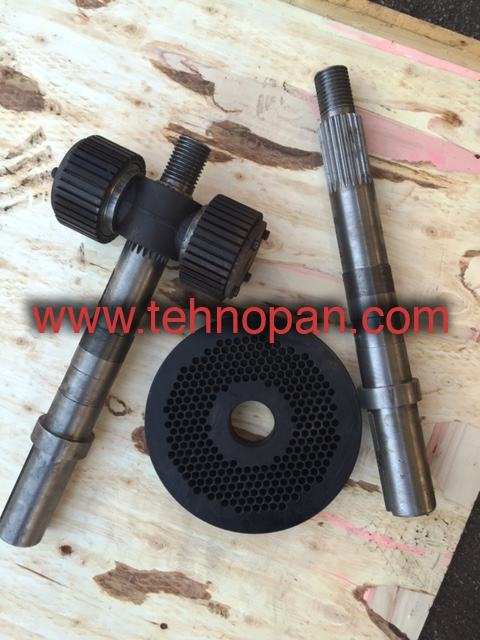 Za peletirke sa okretnom pločom i fiksnim rolerima; Pripremite 2 šake piljevine, 1 šaka kvarcnog pijeska i 1/2 dcl ula strojnog. Zamiješati tako da ruke budu malo masne. Ostavite otpuštene rolere, malo vrtiti i nakon 10-15 min, sipati lagano i cirkulirati sa smjesom 15 min. Očistiti i podignuti rolere za 0,5-1mm zategnuti - fiksirati rolere na radno, pa polako sipati piljevinu (što sitniju). Mješavina 60-65 % tvrdog drvera i 30 do 25 % piljevine mekog drva, propuštena kroz mlin sa rupom ø 4-4,5 mm, je najooptimalnija za sigurnu i kvalitetnu proizvodnju peleta. Za taj slučaj, ako je vlaga niska, možete dodavati raspršenu vodu do > 14 % vlage. Naravno da i vrsta drveta utječe na količinu vlage u "+" i "-" području.