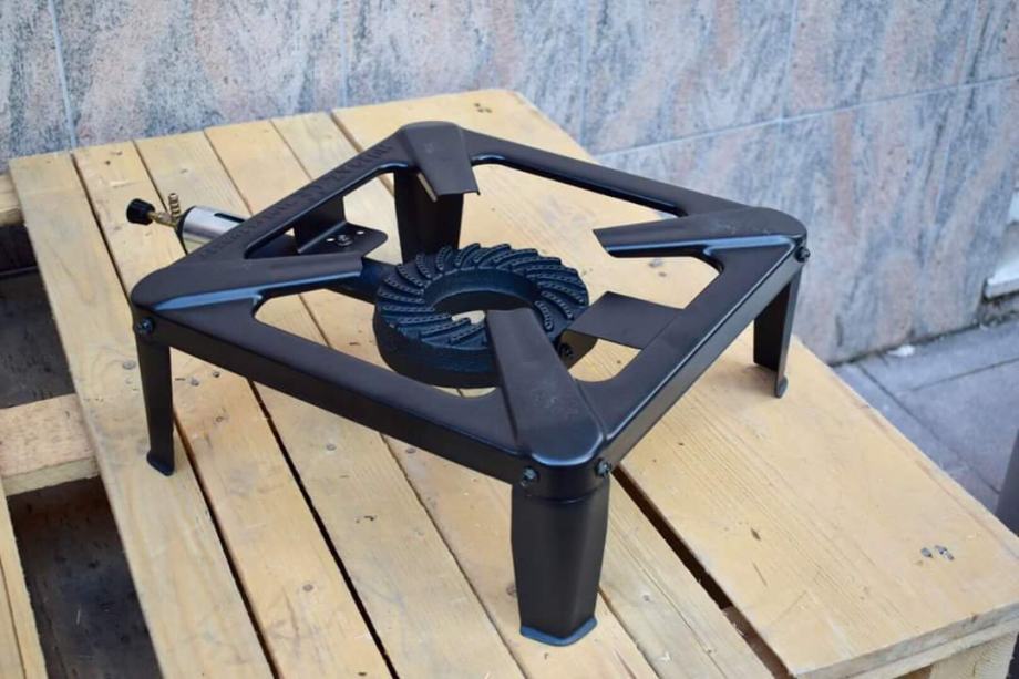 Plinski plamenik neophodan je dodatak uz pripremanje kotlovine. Izrađen je od željeza, a maksimalnu stabilnost osigurale su 4 nogice i postolje za kotliće. Uz plamenik je potrebno kupiti crijevo koje ga spaja s plinskom bocom. Sadrži i kotačić za reguliranje jačine plamena.