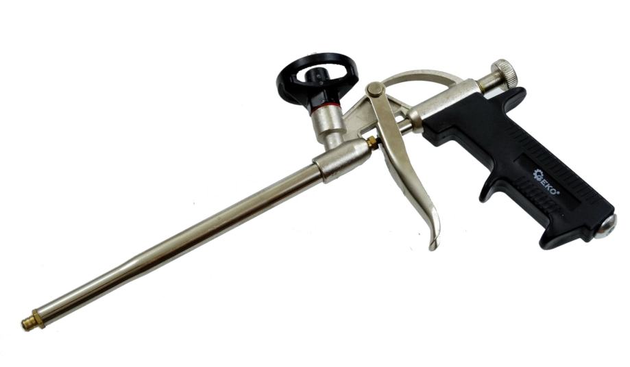 Pištolj za montažu pjene. Pištolj ima gumb koji omogućava precizno doziranje pjene. Kad je instaliran gumb za pjenu, također omogućuje pištolju da koristi pištolj do 30 dana bez potrebe za čišćenjem.
