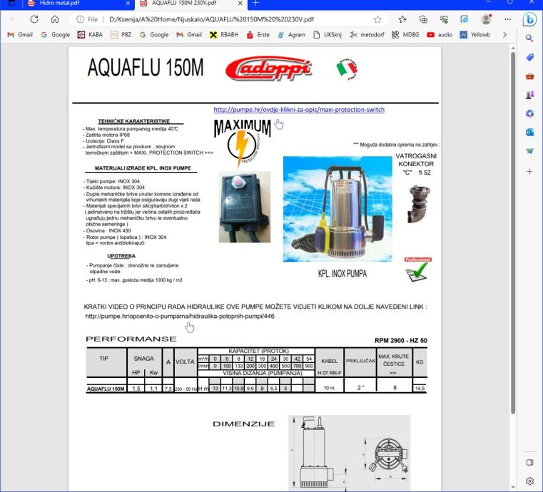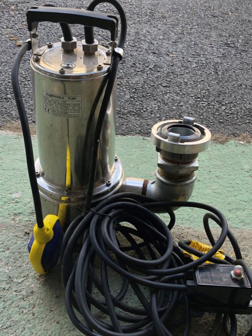 AQUAFLU 150M potopna pumpa, inox, za čistu, drenažnu vodu i zamuljene otpadne vode, vatrogasni konektor "C" fi 52, stabilna spojnica fi 52, koljeno Zn 2" N-V, NIPL Zn 2', vatrogasno crijevo 15m sa spojnicama, korišteno 2-3 puta, u ispravnom stanju.