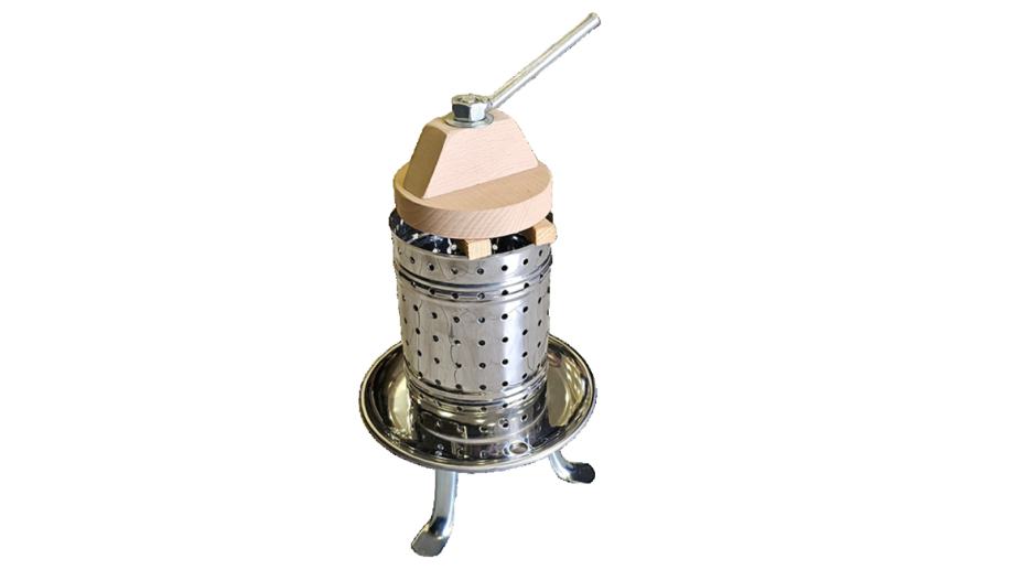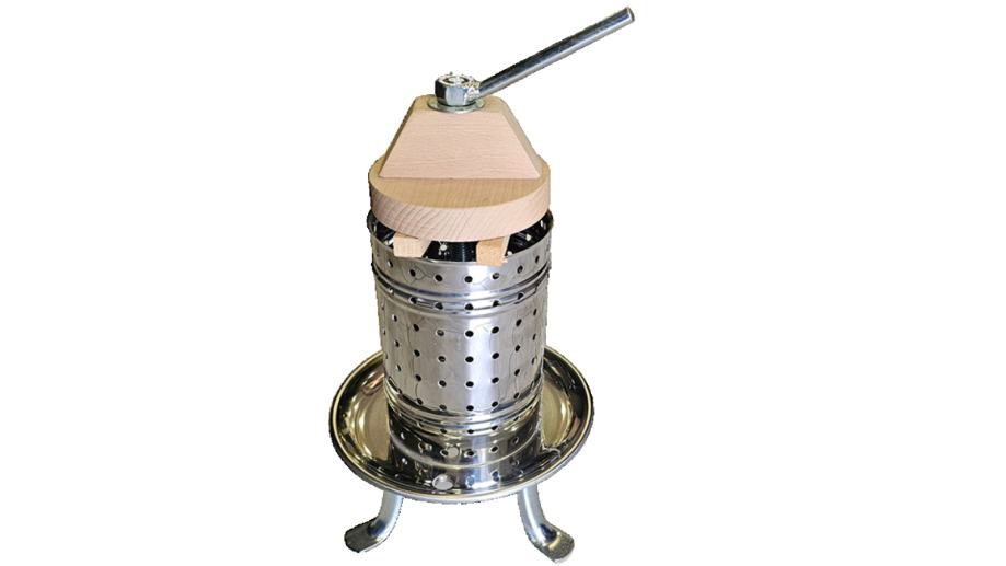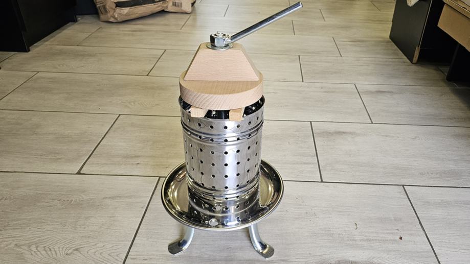 Preša za čvarke 3 litreInox perforirana posudapromjer 14 cmvisina 20 cmŠipka sa navojem u srediniDrveni elemenri za podlaganjeInox postolje sa nogamaRučka za stiskanje sa navojem