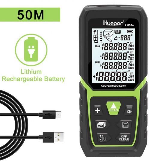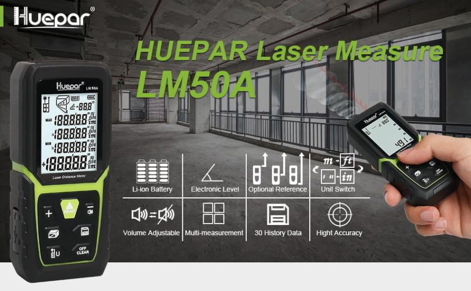 HUEPAR LM50A laserski metar s elektroničkim kutnim senzorom pokazuje podatke o stvarnom vremenu tijekom mjerenja.