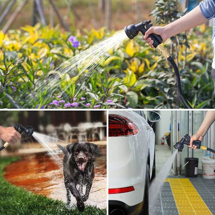Pištolj s 8 vrsta spreja - vrtna cijev opremljena je s 8 rotirajućih mlaznica. Uz njegovu pomoć, zalijevat ćemo zelenilo, cvijeće, kupati kućne ljubimce i oprati automobil. Tlak vode možete prilagoditi na dva načina: s vijkom ventila i pomičnom ručkom. Pištolj također ima funkciju zaključavanja - samo odvratiti metalnu kuku u pištolju - voda će se tada pokrenuti bez da stalno pritisnete okidač pištolja.