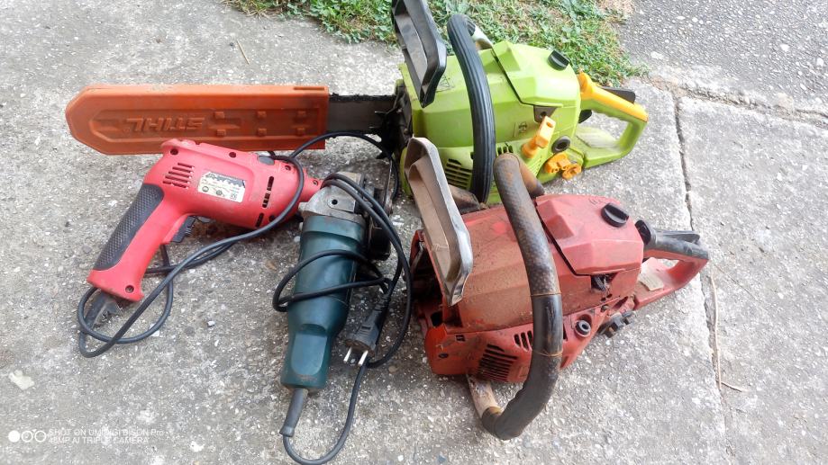 Prodajem sa slike busilica (cetkice treba promjeniti), flekserica (upitno stanje) te jedna motorna pila sa vodilicom i jedna bez vodilice kod obje upitno stanje ako nekom treba za popravak il dijelove prodajem sve za 30 eura!