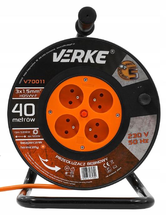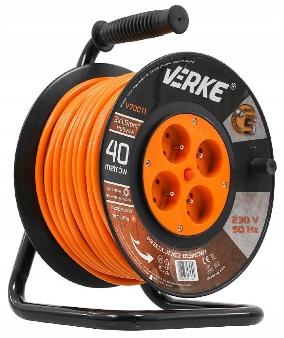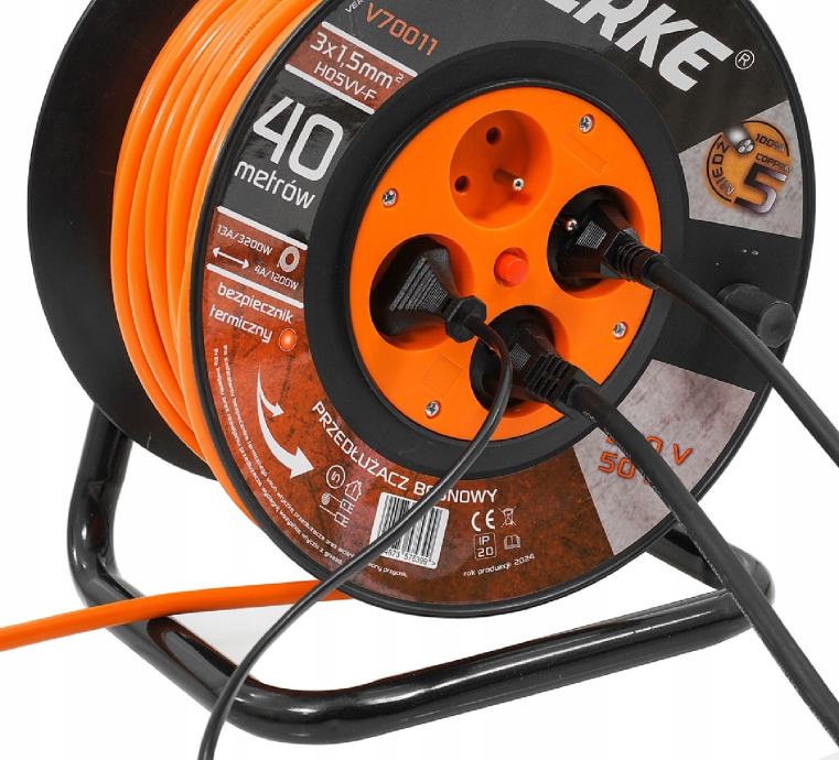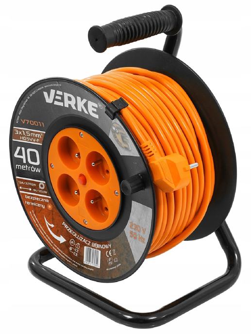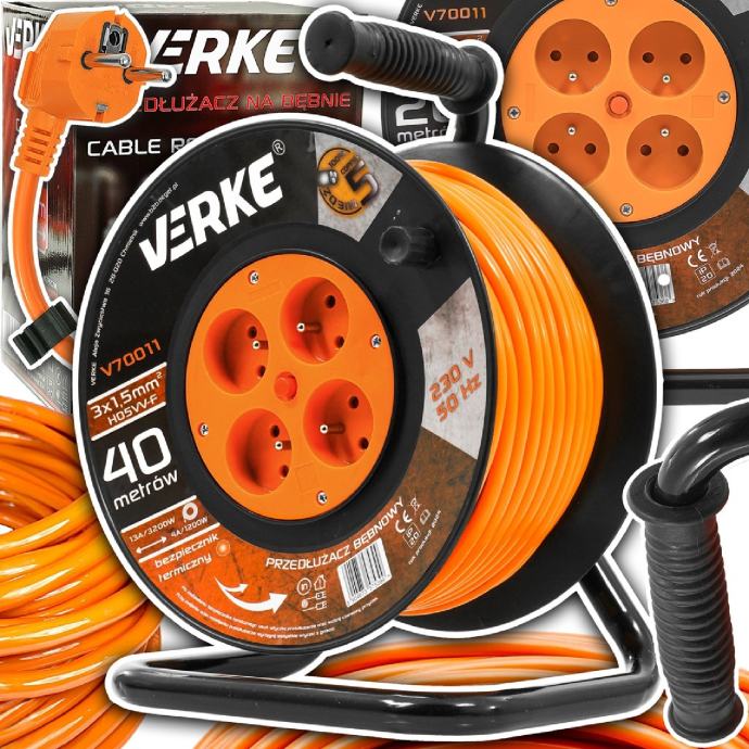 Visokokvalitetni produžni kabel u kolutu, dužine 40 m, sa 4 utičnice. Kabel je izrađen od 3 bakrene žice poprečnog presjeka od 1,5 mm² svaka. Ovakav presjek kabela omogućuje istovremeno spajanje četiri uređaja na ove produžne kabele, što je posebno korisno na gradilištima ili u radionicama. Kabeli su prekriveni PVC izolacijom H05VV-F koja je vrlo otporna na mehanička oštećenja, atmosferske čimbenike i kemijske tvari. Produžni kabel je opremljen toplinskim osiguračem.