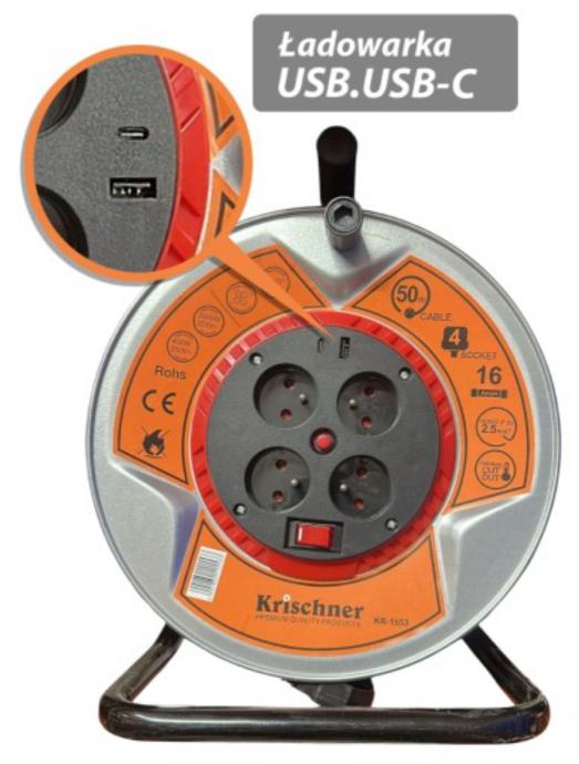 Produžni kabel na metalnom kolutu duljine 50m (3x2,5mm) s 4 utičnice, USB ulazom, te s jednim C ulazom.