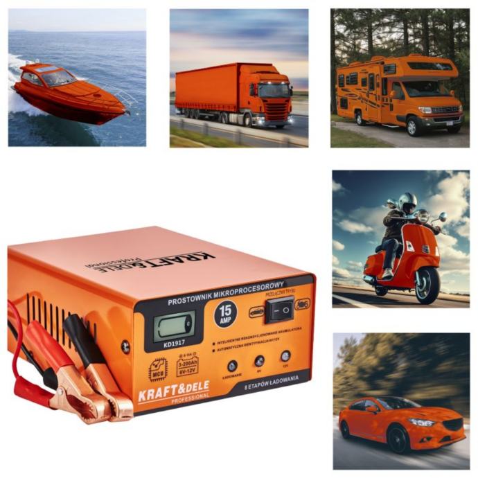 Mikroprocesorski punjač KD1917 poljske tvrtke Kraft & Dele napredni je uređaj dizajniran za punjenje svih vrsta olovnih akumulatora, uključujući WET, MF, CA, EFB, GEL i AGM. Zahvaljujući inteligentnoj elektronici i 8-stupanjskom automatskom procesu punjenja, uređaj prilagođava radne parametre kapacitetu i razini pražnjenja akumulatora, osiguravajući brzo i sigurno punjenje.