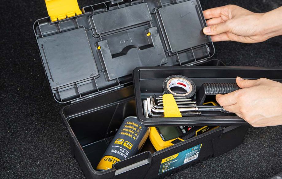 S dimenzijama od 330 x 160 x 125 mm i odjeljcima na poklopcu, kutija s alatima može pohraniti različite tipke, nokte, vijke itd.