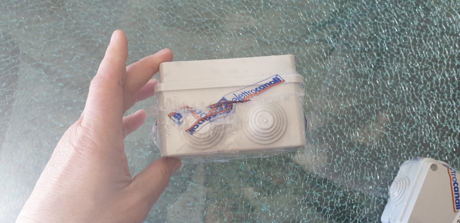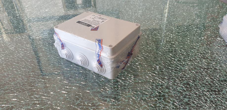 Nadžbukna (N/O) razvodna kutija, proizvođača Elettrocanali, izrađena od ABS plastike sive boje RAL7035, dimenzija 150 x 110 x 70 mm, sa zaštitom IP55 i IK08, ima 10 M25 gumenih uvodnica i vijčani poklopac.