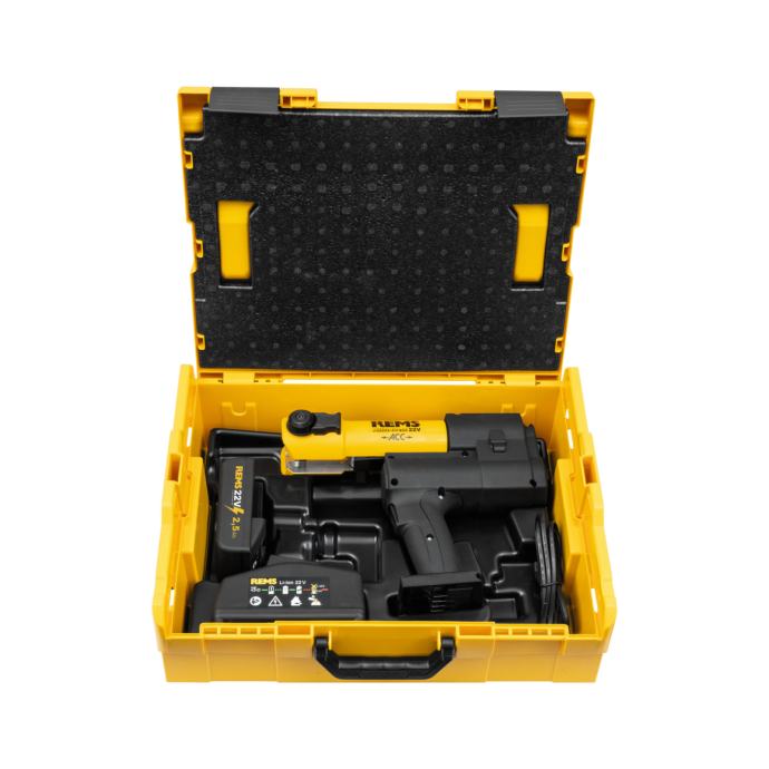 Baterijska radijalna preša od 32kN s prisilnim povratnim hodom i nadzorom tlaka prešanja za izradu stisnutih spojeva fi10-108(110)mm fi3/8"-4". Za pogon REMS kliješta/prstena za stiskanje i odgovarajućih kliješta/prstena za stiskanje drugih proizvođača.