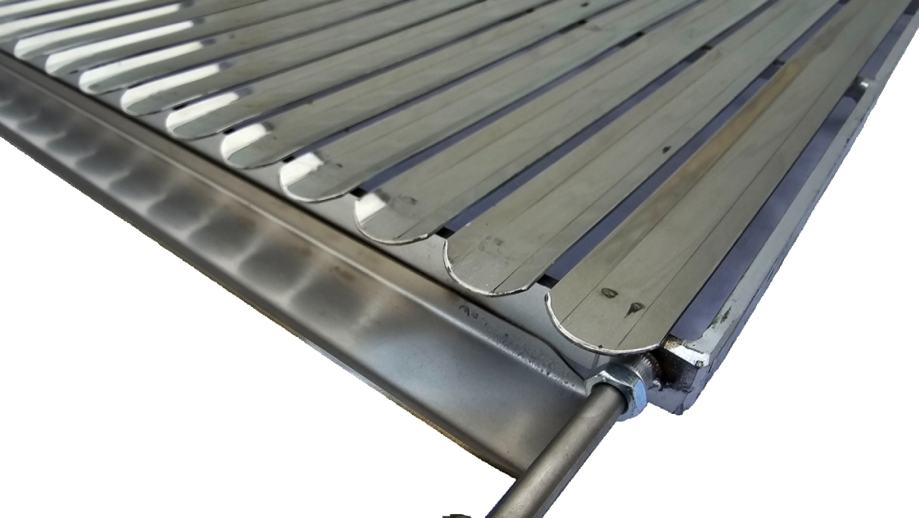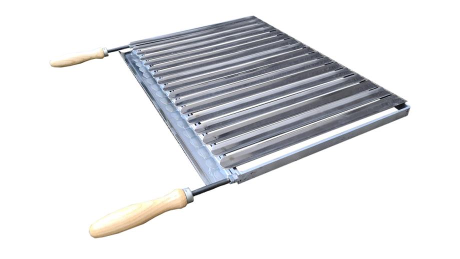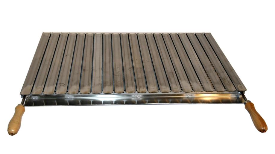 Rešetka roštilja od inox prečki debljine 1,5 mm. Okvir roštilja od plosnatog željeza 20x5 mm. Sa žlijebom za mast i drvenim ručkama za nošenje. Kompletno varen i besprijekorno čvrst.