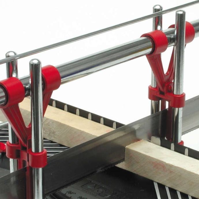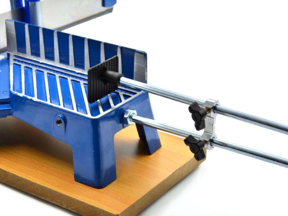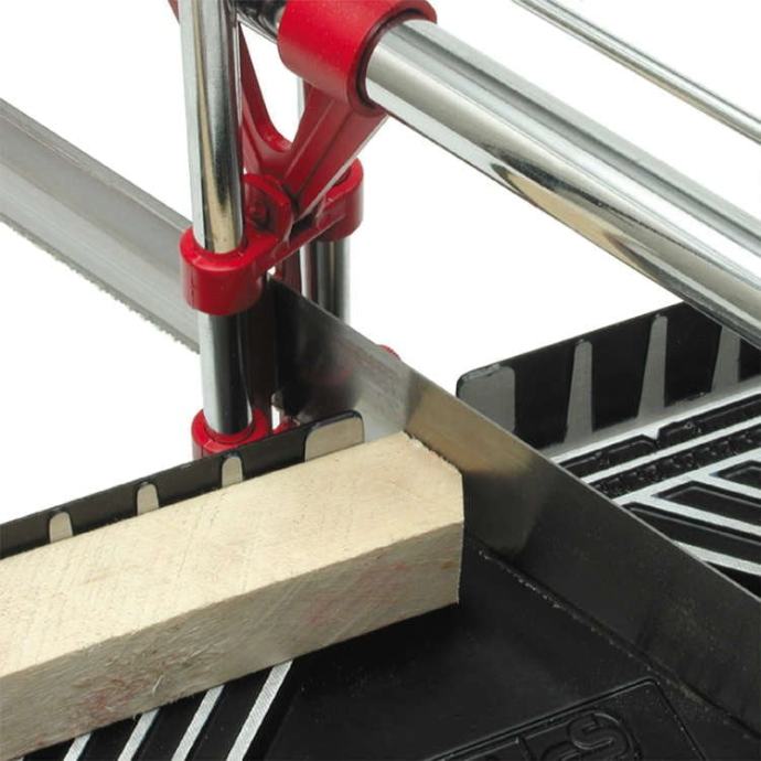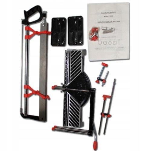 Ova pila za graviranje prikladna je za univerzalnu upotrebu u radionicama, proizvodnji i privatnom sektoru. Pilu možete izrezati pod kutom od 22,5, 30, 36, 45 i 90 stupnjeva za drvo i plastiku. Okvir glomaznog pila izliva se iz jednog komada, čvrste aluminijske legure, duljine 400 mm. Kao što se može prilagoditi točno otkrivanjem ručica prema težini. Čvrsti stol pila i dvije noge od izdržljive plastike osigurava stabilnost tijekom piljenja. Posebno kaljeno oštrica s finim univerzalnim zubima ima duljinu od 550 mm, dubinu rezanja 100 mm i širina reza od 110 mm. Dubina reza mora se postaviti s visinom potpornih prstenova između četiri vodeće šipke dizajnirane su tako da omoguće stabilno i točno liječenje.