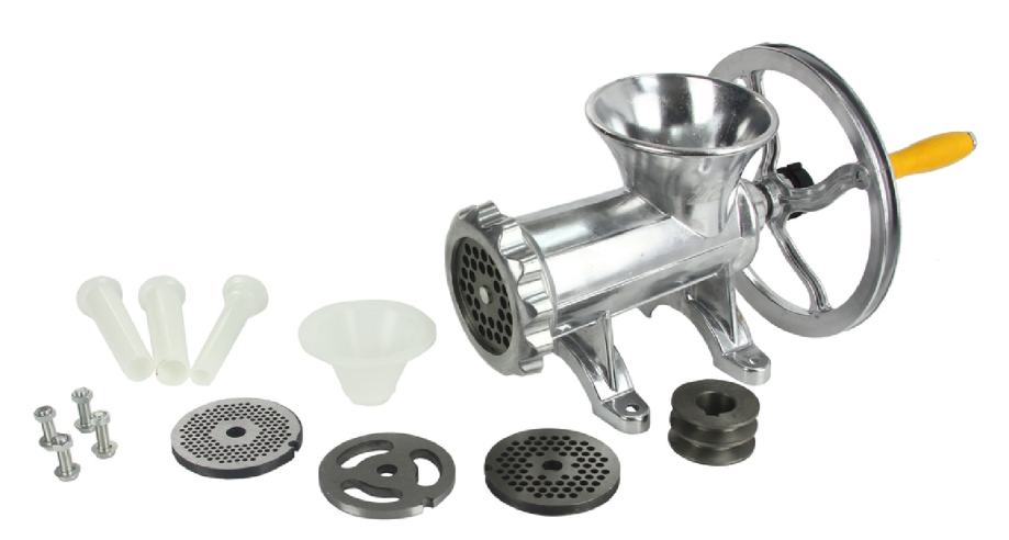 Ručni stroj za mljevenje mesa - veliki M90137 izrađen je od aluminijske legure što ga čini laganim i čvrstim . Ovaj klasični ručni mlin s velikom polugom za okretanje nezamjenjiv je pomoćnik ne samo u mesnicama. Zahvaljujući remenici, koja je dio pakiranja, moguće ju je spojiti na elektromotor i tako je pretvoriti u profesionalni stroj za mljevenje mesa, voća ili izradu kobasica.