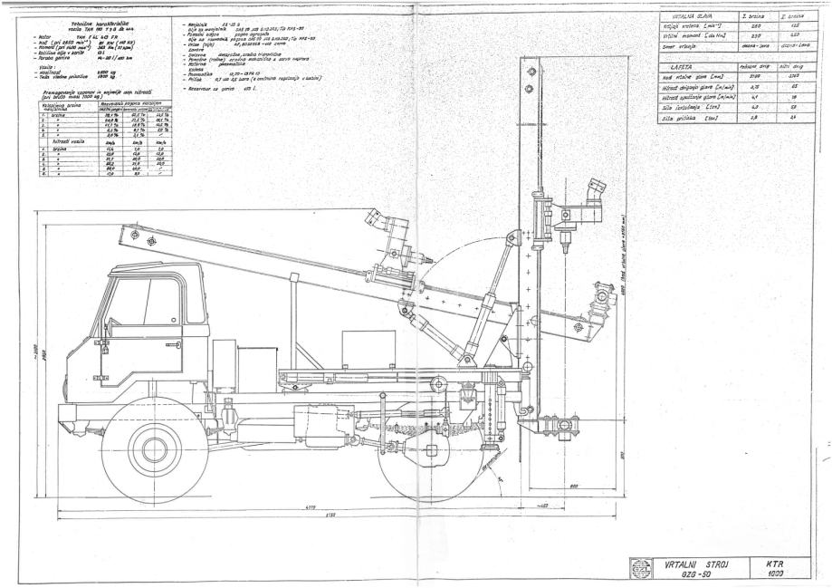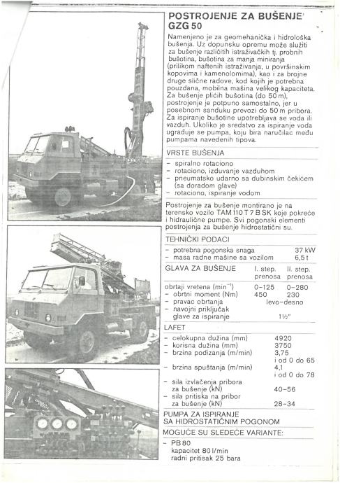 Prodaje se bušaće postrojenje GZG 50 montirano na terenski kamion TAM 110 (vojne izvedbe). U prometu od 1986.g. Tehnički podaci bušaćeg postrojenja prikazani su na slici. Registriran do 8./2025. Na bušilici je motirana spiralna pumpa 20 bara, mazura za izvođenje SPP ispitivanja (poluautomatska na vitlo) i kompresor za izbijanje jezgre.