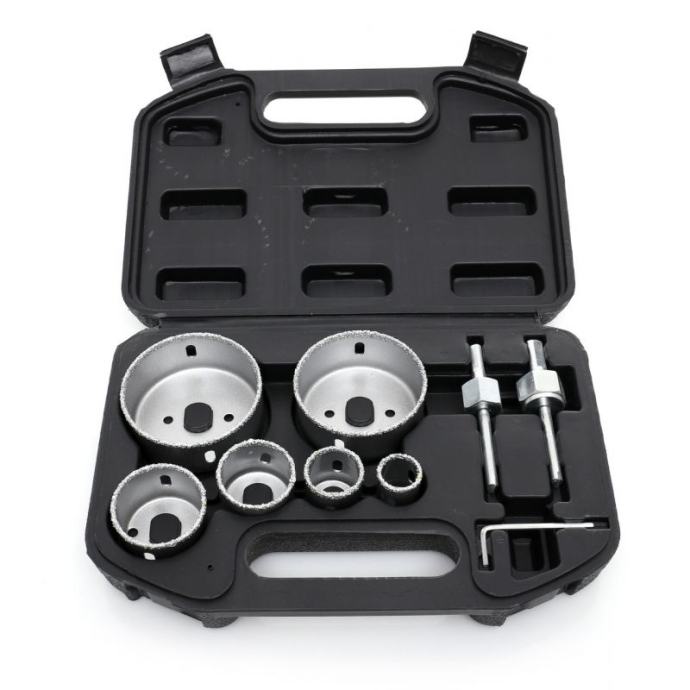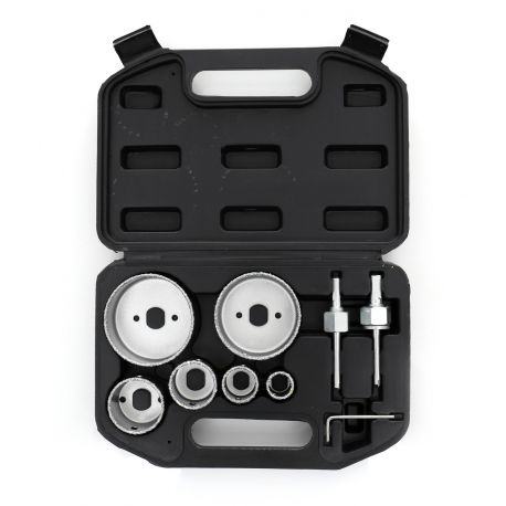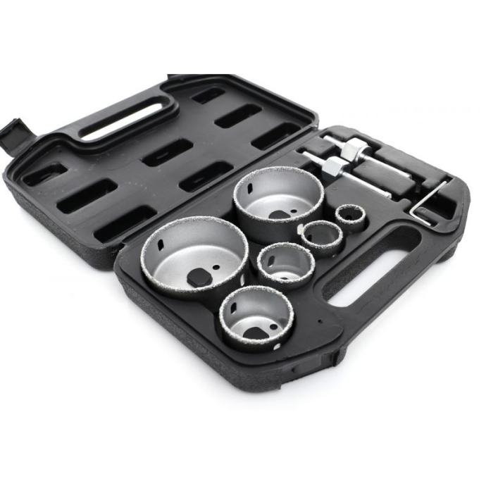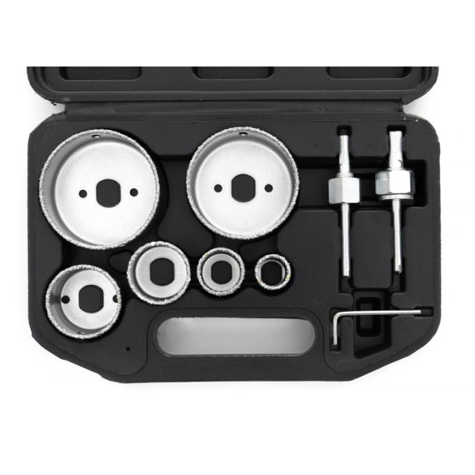 Komplet KD10285 sadrži 6 rupa za pile veličine: 22, 29, 38, 44, 67, 73 mm, imbus ključ i dva adaptera s svrdlom.