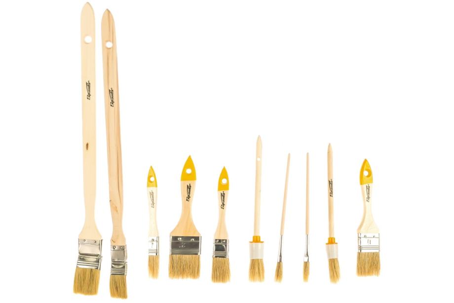 Čekinje su podijeljene na krajevima, što poboljšava svojstva prijenosa boja na četkicama. Komplet uključuje 3/4 "ravne četke i 2 inča, okrugli br. 2, br. 4, radijator 1 i 1,5 inča i dva br. 2 i br. 6 za uljne boje za udobnost u različitim područjima, uključujući teške dostupne i uske Na ručkama su posebne rupe, zahvaljujući koje četke mogu objesiti.
