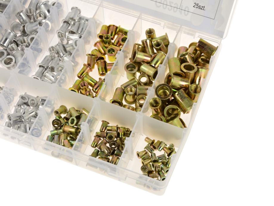 Asortiman od 300 komada čeličnih i aluminijskih zakovica u 6 popularnih veličina M3 - M10. Kompatibilan s priključcima odgovarajuće veličine navoja.