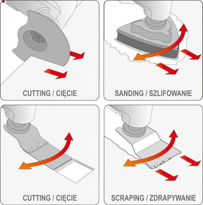 Komplet također uključuje širok izbor dodataka, poput lopatica za rezanje drveta, metala i plastike, ploče za mljevenje za mljevenje različitih površina i ploče strugača za uklanjanje boje ili ljepila. Bilo da se radi o obrezivanju, uklanjanju, mljevenju ili poliranju, ovaj višestruki alat pružit će točne rezultate bez napora.