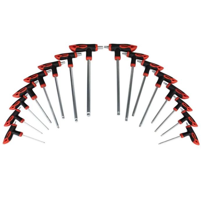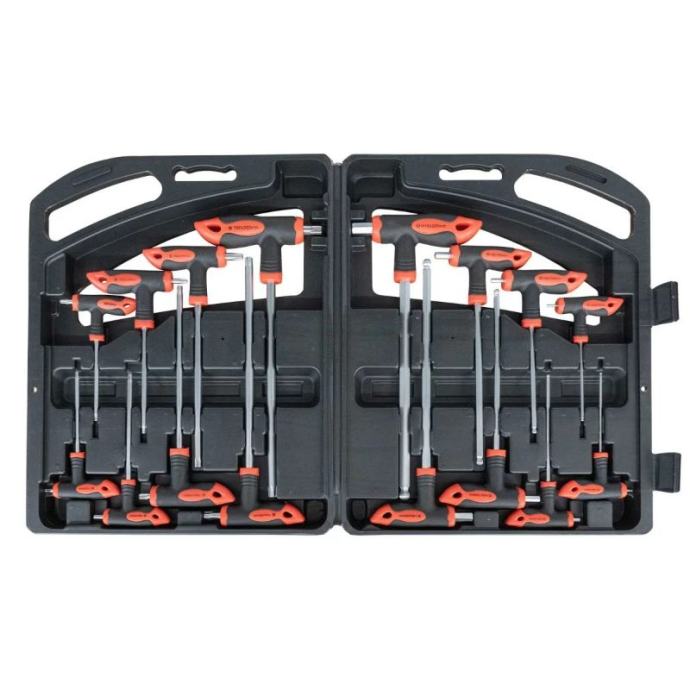 set nasadnih ključeva s T-ručicom 16 komadanaši nasadni ključevi s T-ručicom opremljeni su ergonomski dizajniranom dvokomponentnom ručkom, koja omogućuje dodatno držanje i prijenos maksimalnog zakretnog momentaoštrica je izrađena od kaljenog i od korozije zaštićenog krom-vanadij čelika, što čini ključeve alata vrlo izdržljivimas niskom kuglastom glavom čak se i teško dostupna mjesta mogu zategnuti ili olabaviti pod kutom od 30°Tehnički podaci: šesterokutni ključ: H2 x 75, H2,5 x 75, H3 x 100, H4 x 100, H5 x 150, H6 x 150, H8 x 200, H10 x 200 mmTX: T10x75, T15x75, T20x100, T25x100, T30x150, T40x150, T45x200, T50x200 mm]]>